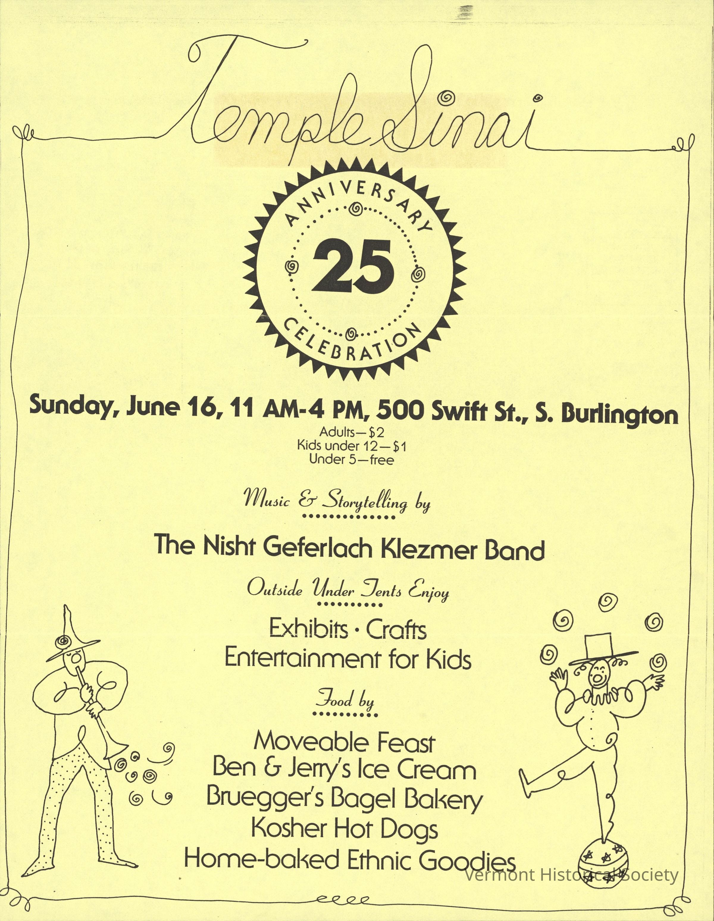 Broadside advertising the 25th anniversary of Temple Sinai in Burlington