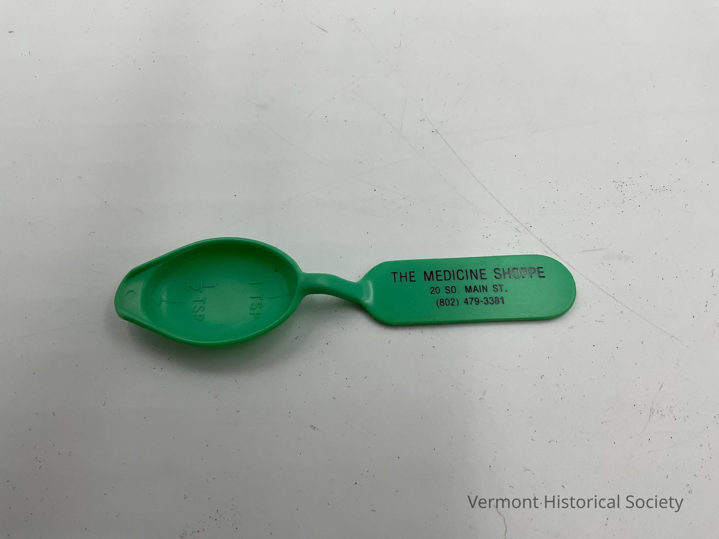 A green, plastic spoon for measuring liquid medicines. It advertised "The Medicine Shoppe, 20 So. Main St,, (802) 479-3381."Context