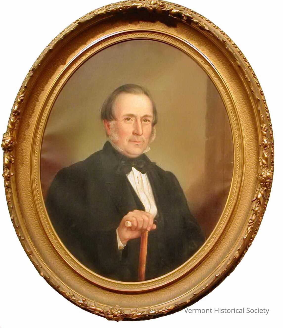 Oval portrait showing a man wearing a black three-piece suit, a white, pleated-front shirt with a high collar, and black bow tie. His grey hair is swept back and he has long, white sideburns. His right hand rests on the handle of a cane.Type of Painting
