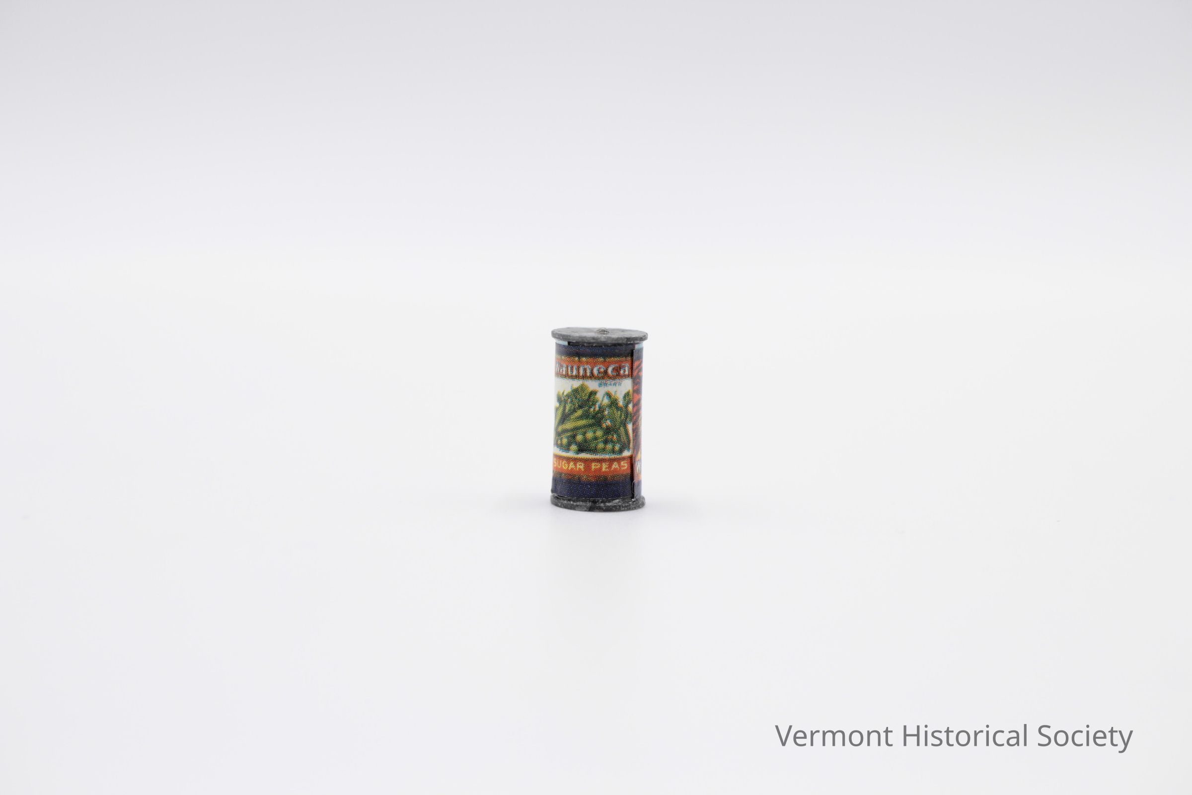 Miniature cylindrical food-storage can. The can is made of silver-colored plastic and is wrapped with a printed paper label. One side of the paper label shows a bunch of split pea pods with the words, "WAUNECA SUGAR PEAS". The other side shows a stereotypical image of an indigenous American man wearing a large war bonnet.Context