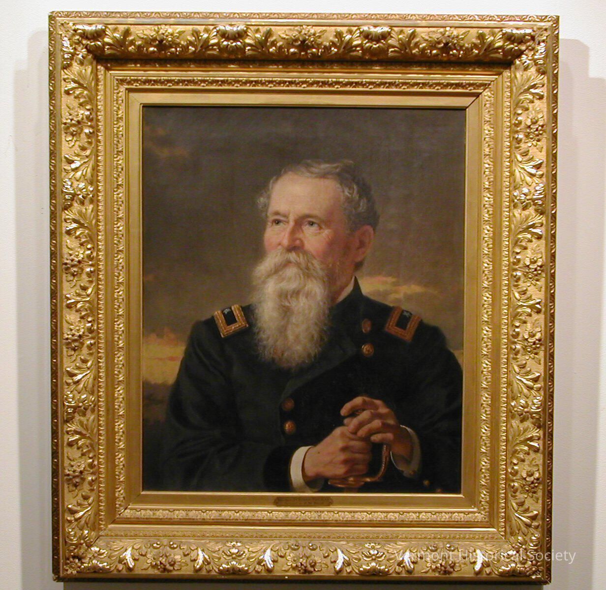 Portrait to the waist of an older man in uniform. He has short gray hair, parted on the left, blue eyes, a full mustache, and a long gray beard. Four gold buttons on front of his military coat are visible. He is holding the handle of a gold sword and stands before a dark sky with golden clouds.Artwork Details