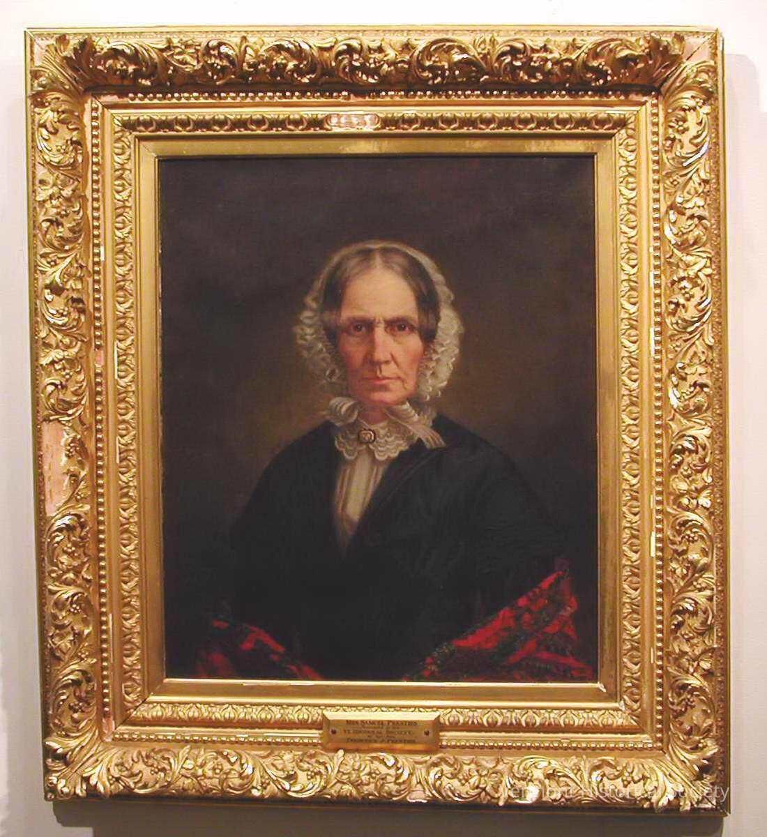 Portrait of an older woman with center-parted dark grey hair. She is wearing an elaborately ruffled white cap and a white blouse with a ruffled collar. Over the blouse she is wearing a black dress and holding a red paisley shawl around her arms. The background is dark brown, and the whole is framed in an ornate gilded frame.Artwork Details