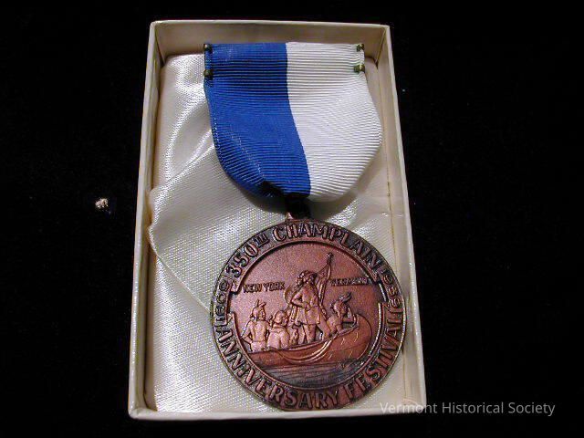 Commemorative medal consisting of a medal and ribbon. The grosgrain ribbons is half blue and half white, with a pine at the top back. The round medal hangs from the center bottom of the ribbon and is molded with a scene of a European man standing in a canoe. Three men in representational Native American dress kneel or crouch around him. The words, "350TH CHAMPLAIN ANNIVERSARY FESTIVAL", ring the edge.Context
