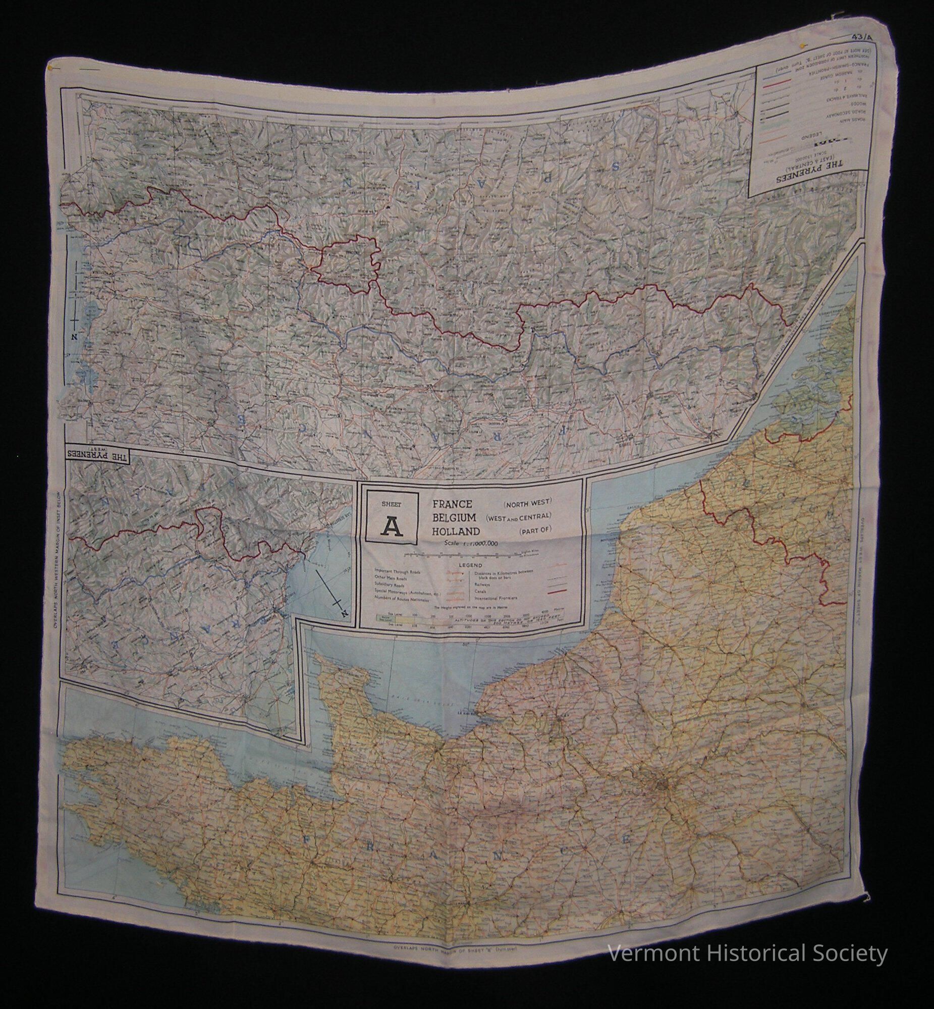 Large two-side map printed on silk. One side shows three maps: "The Pyrenees (West)", "The Pyrenees (East & Central)", and "France (North West) Belgium (West and Central) Hollard (Part of)". The other side shows two maps: "German - Swiss Frontier", and "France (South West) Spain (North)".Context