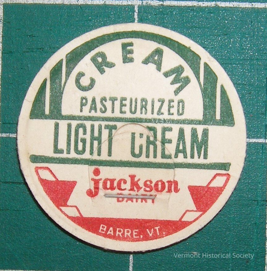 Tab for cream bottle lid. The tab is circular with a white background and a green and red geometric design along the edges. The text "CREAM / PASTEURIZED / LIGHT CREAM / jackson / DAIRY" is printed inside the design, with the first four words being green and the last two red. There is a staple at the base of the lid.Acquisition