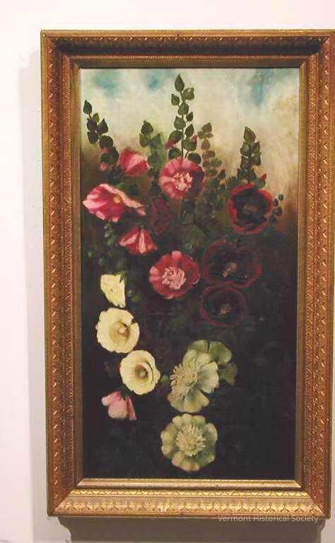 Painting showing several stems of hollyhock flowers. Toward the bottom of the composition, the flowers are white; at the top left, they are pink with stripes; at the right they are red and black. The background in white and blue at the top, fading quickly to brown and black. It is framed in an ornate, gilded frame.Type of Painting