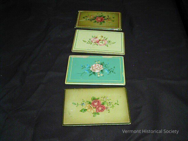 Painted wooden tiles. Each tile is decorated with a floral sprig on a solid or slightly gradient ground. The back of each tile has a paper label that reads, "BIRCH BEDROOM FURNITURE / The BEECHER FALLS COMPANY, Inc. BEECHER FALLS, VERMONT". In the center of each label is the style/color name and inventory number.