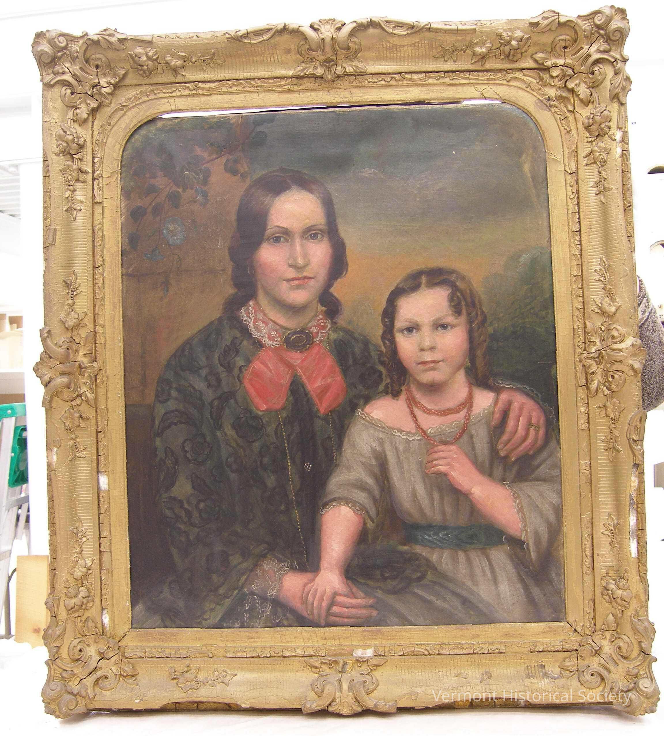 Painted portrait depicting an adult woman and child. The woman has light skin and dark brown hair. She is wearing a green jacket with black floral decoration and a grey skirt. She has a short white lace collar over a rd ribbon with a large oval brooch at the center. The child has light skin and brown hair. She is wearing a grey tunic-style dress belted at the waist with a blue moire ribbon. She is wearing a double-strand red beaded necklace. The painting is framed in an ornately molded gilded frame.Type of Painting