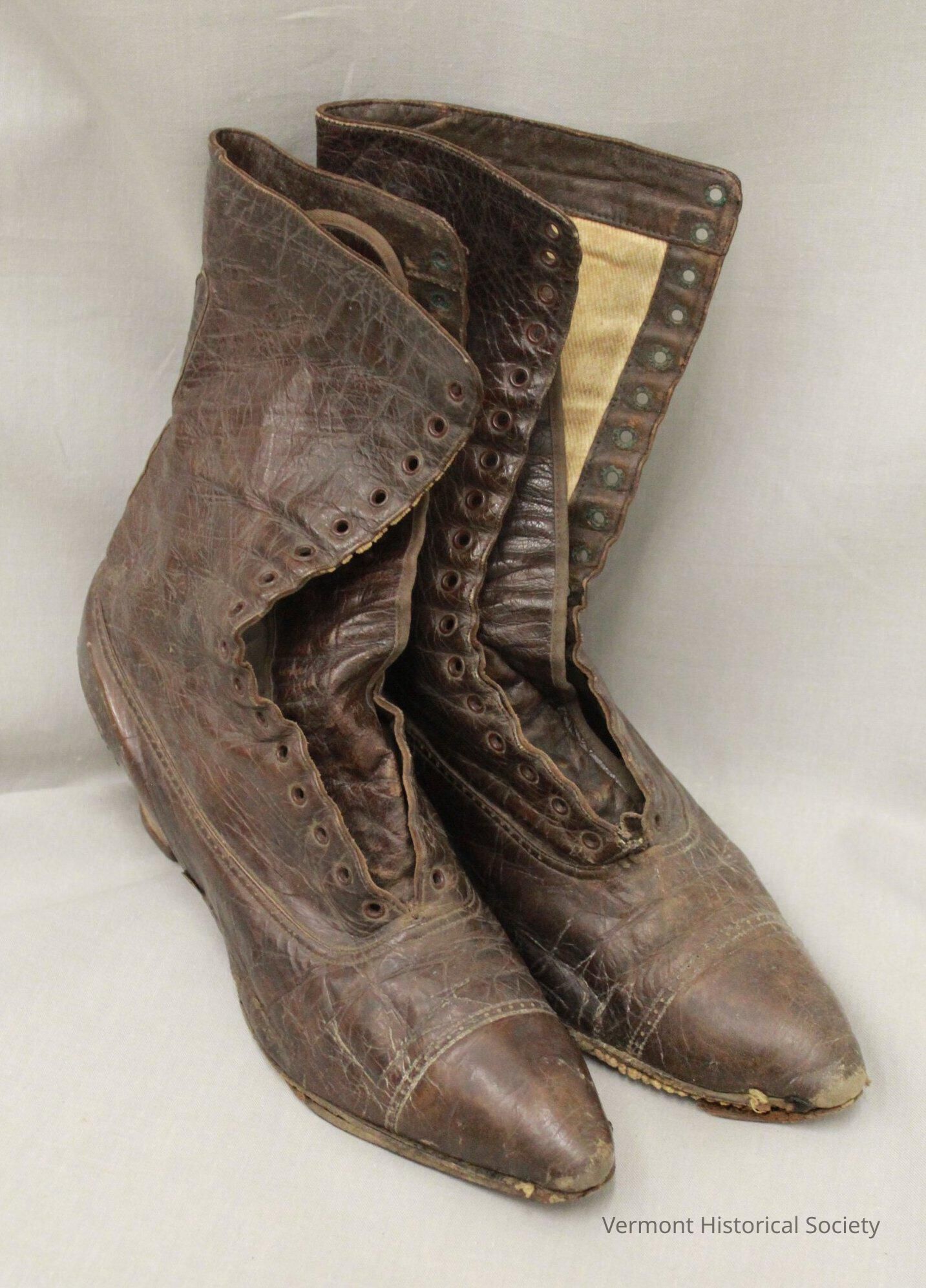 Brown leather lace-up boots with pointed toes. The boots reach above the ankles and a have a low heel. They open up the center front over a tongue and secure with lacing through metal eyelets (lace no longer present).