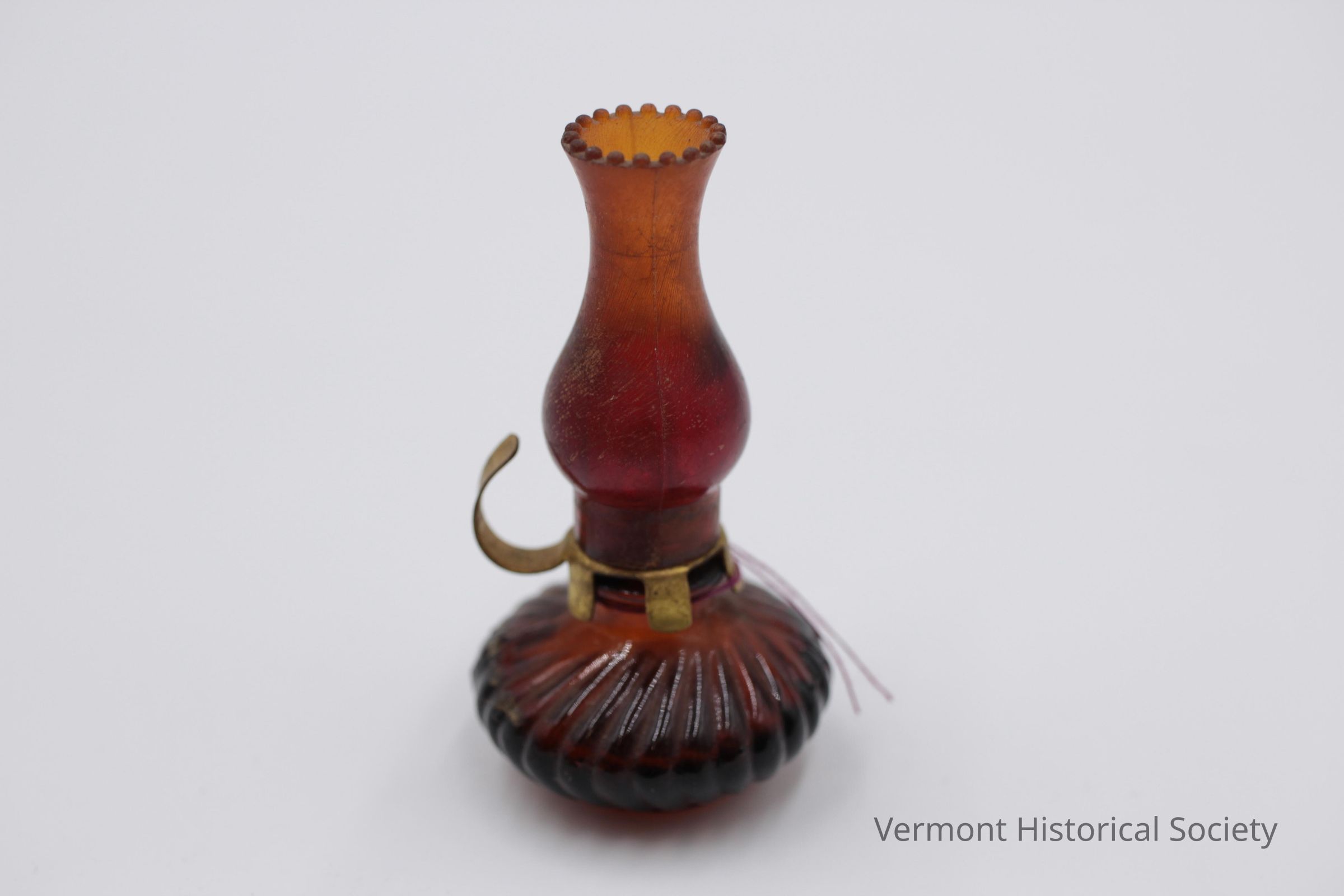Miniature oil lamp made of semi-transparent brown plastic. The lamp consists of a round, fluted reservoir and a tall hurricane. The two sections are held together with a small brass fitting bent into a handle on one side.Context