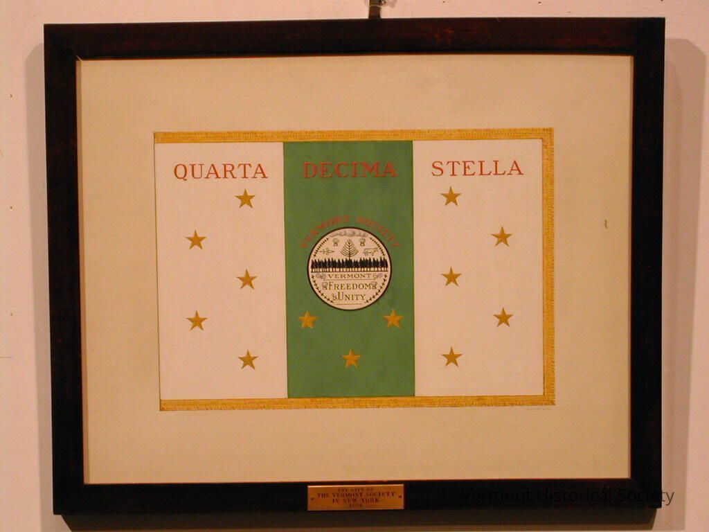 At the top of the drawing, the words "QUARTA DECIMA STELLA" are written. In the center of the drawing, the Vermont state seal is depicted. The flag features thirteen gold, five-pointed stars.Acquisition