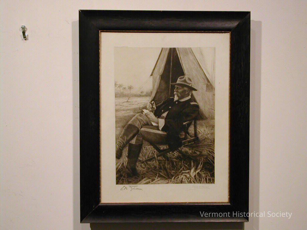This portrait is a full-length depiction of a man who is sitting in a chair. In the background of the portrait, there is a tent visible. The man in the portrait is shown in a Civil War style uniform and is sitting in a folding chair amidst tall grass. He is holding a cigar and has a paper in his lap. The man also has a white beard and mustache visible in the portrait.