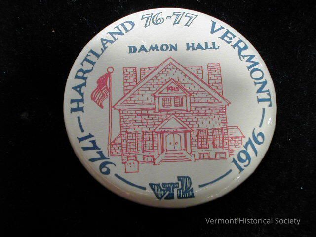Round white button with the blue inscription, "HARTLAND 76-77 VERMONT 1776 1976" around the edge, and a red line drawing of a building with the label "DAMON HALL". The Vermont Bicentennial logo is drawn at the bottom.Context
