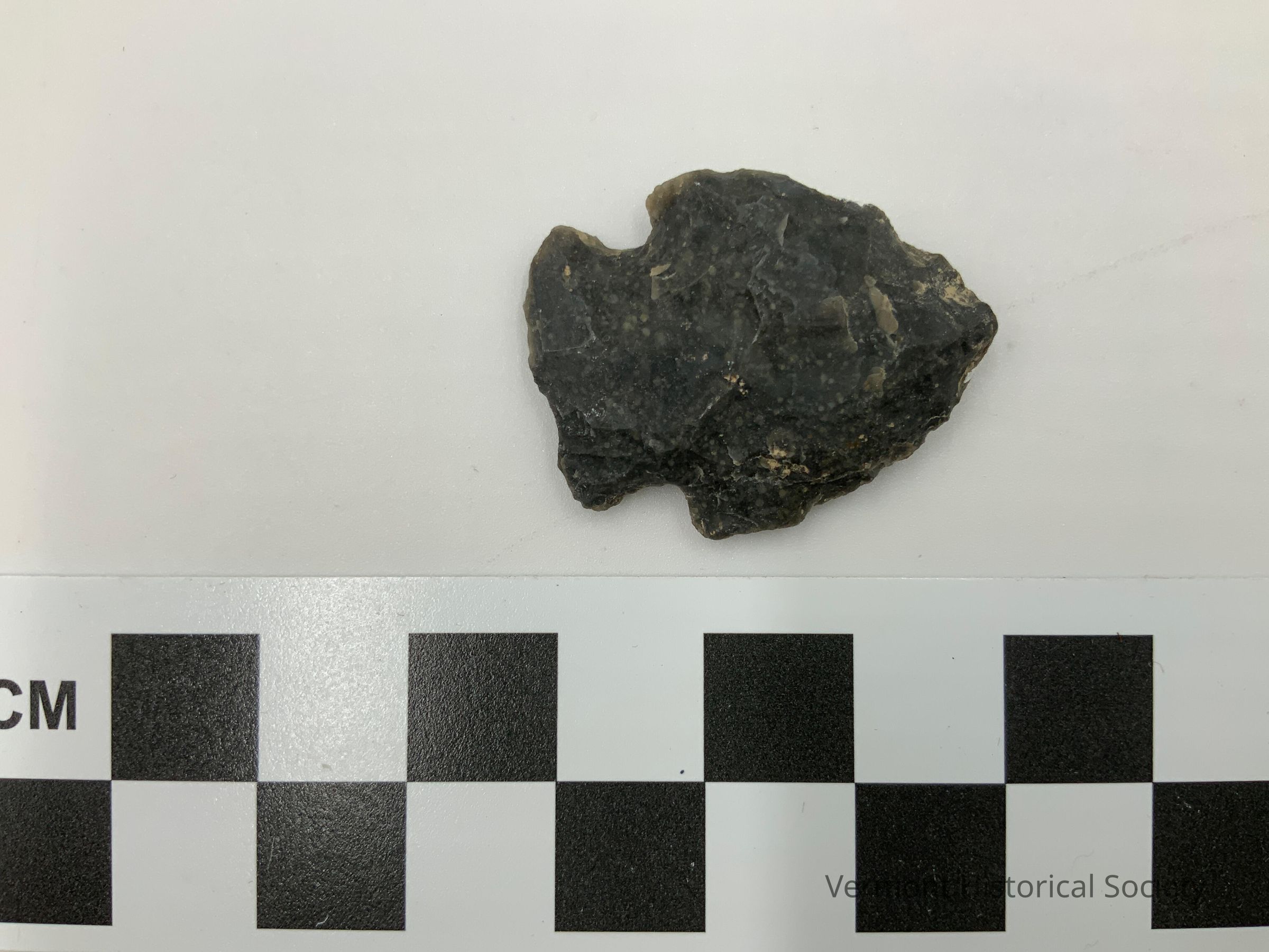 Black chipped stone projectile point with corner notches. The blade edges curve outward and are symmetrical.