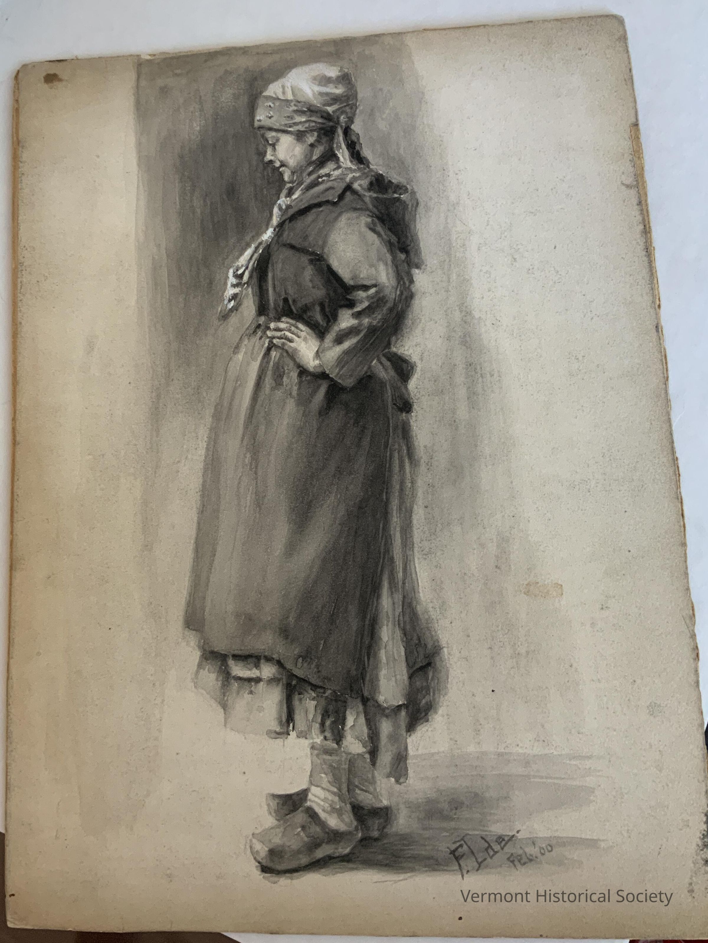 A watercolor of a woman standing in profile. Black and white. She wears a headscarf, necktie, many skirts, and clogs. She is looking down slightly. It is signed in the bottom right corner and dated “Feb. ‘00.” Paper is mounted on cardboard.Acquisition