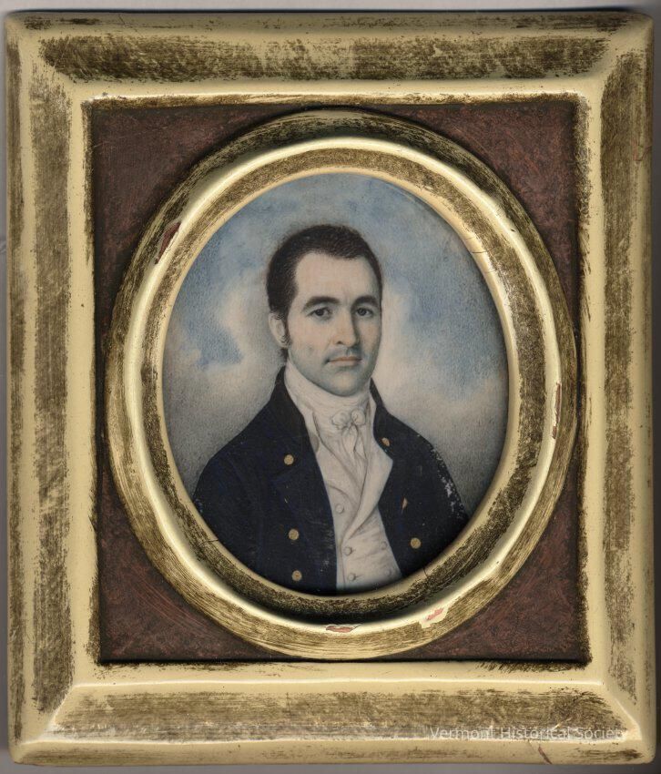 Miniature portrait of a man. The man has short, dark hair, a dimple in his right cheek, and is looking straight at the viewer. He is wearing a white shirt with cravat, a white, double-breasted waistcoat, and a dark coat with brass buttons. He is shown in front of a blue sky with white clouds. The painting in held within a double frame: the inner frame is an oval, and the outer frame is a rectangle.Type of Painting