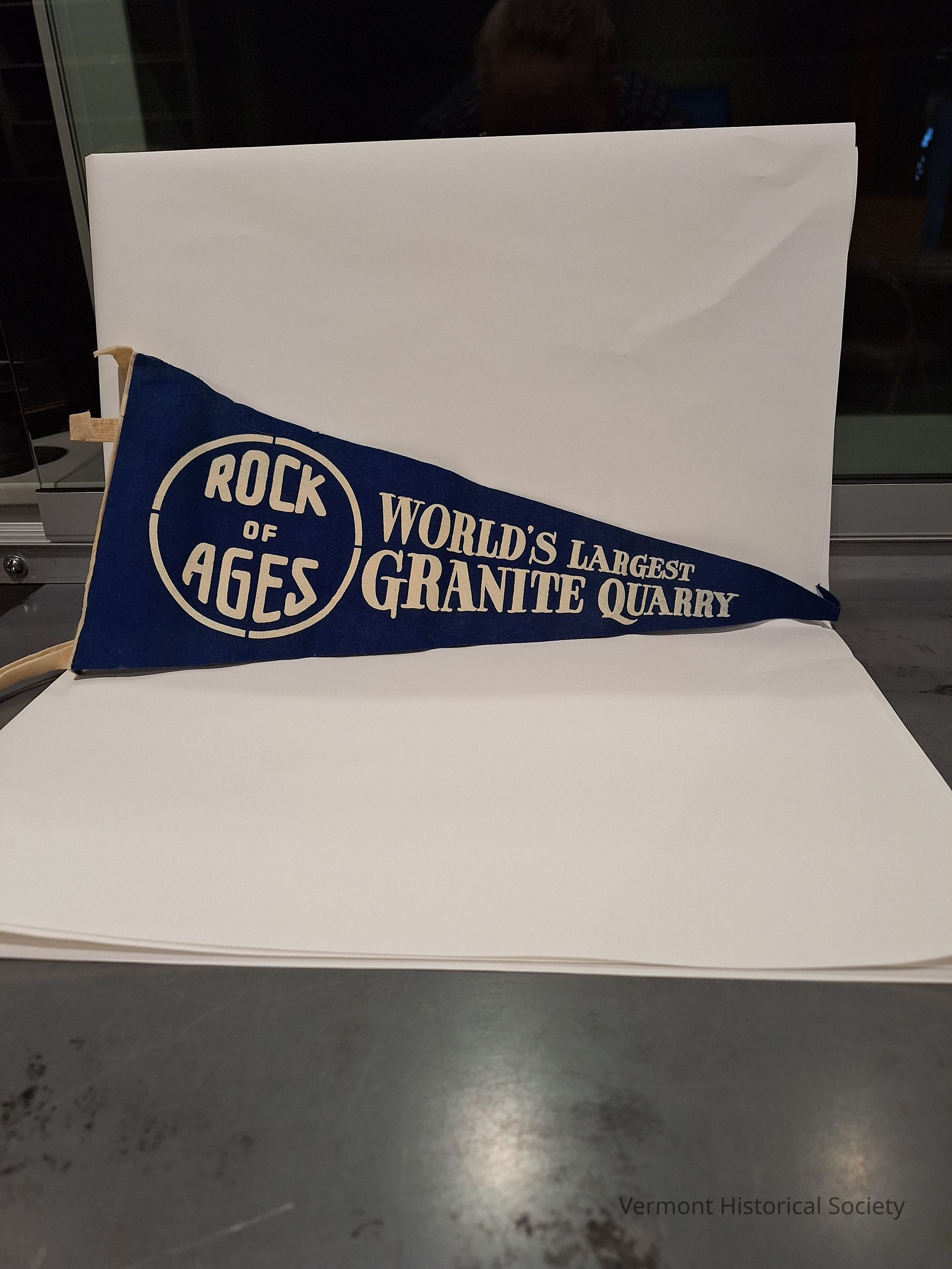 Small pennant from the Rock of Ages Museum. The dark blue pennant has white felt edging and ties along the short side and white printed lettering that reads "ROCK / OF / AGES" in a circle to the left, wider section and "WORLD'S LARGEST / GRANITE QUARRY" in increasingly smaller print towards the pointed end.