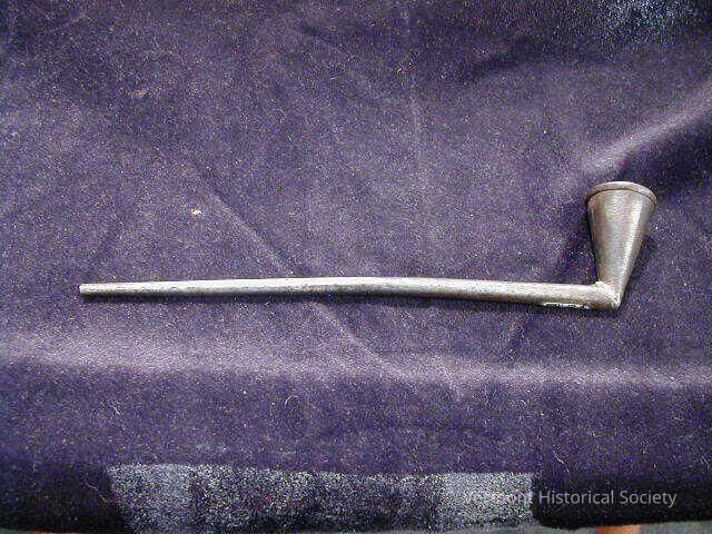 Tin pipe consisting of a long tapered tube attached to a cone-shaped bowl.
