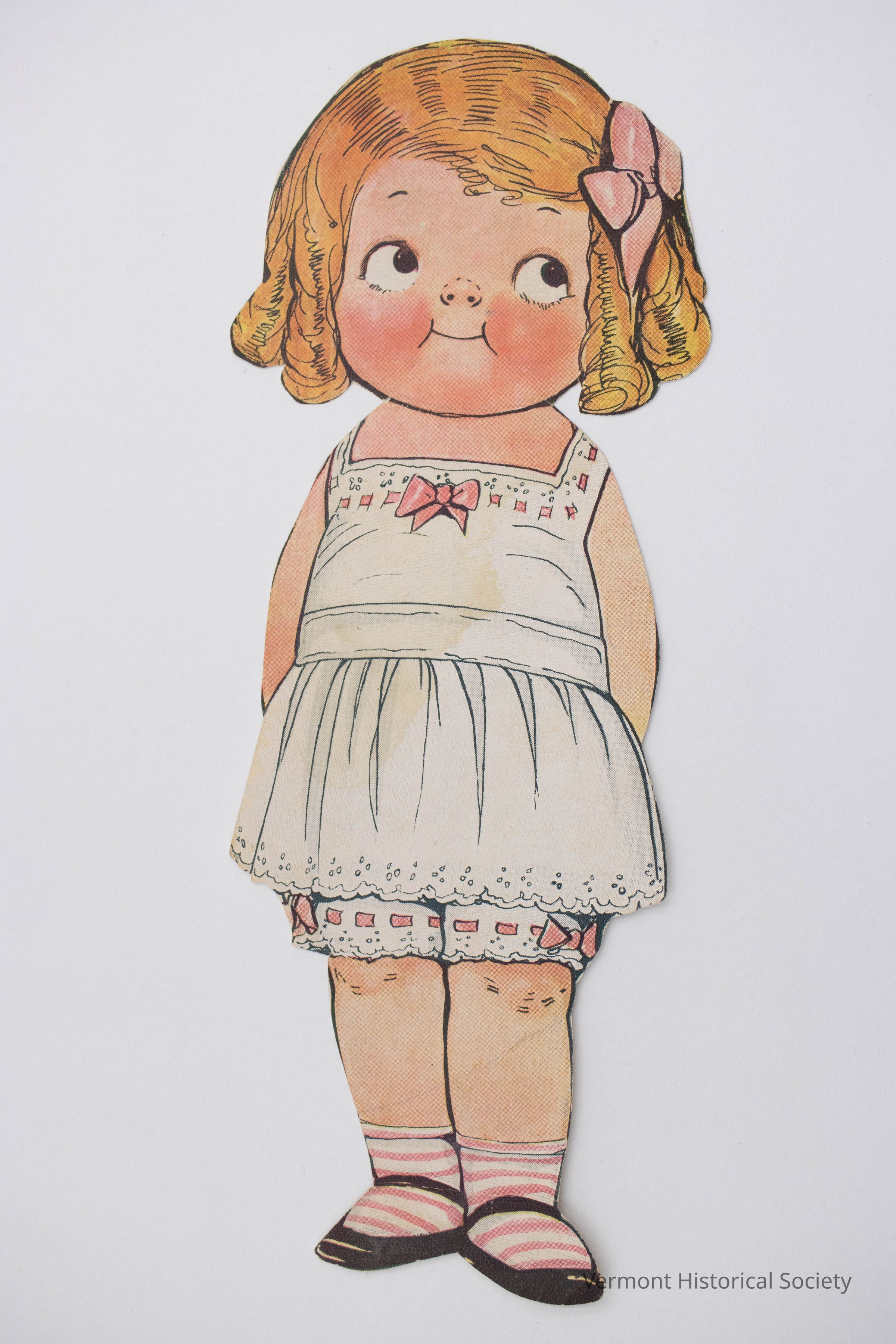 Small paper doll. The doll depicts a young child with yellow hair and pink skin wearing a white dress undergarment, pink-and-white socks, and black shoes. The back shows a portion of a magazine page and the handwritten label, "Annabelle Lee".Context