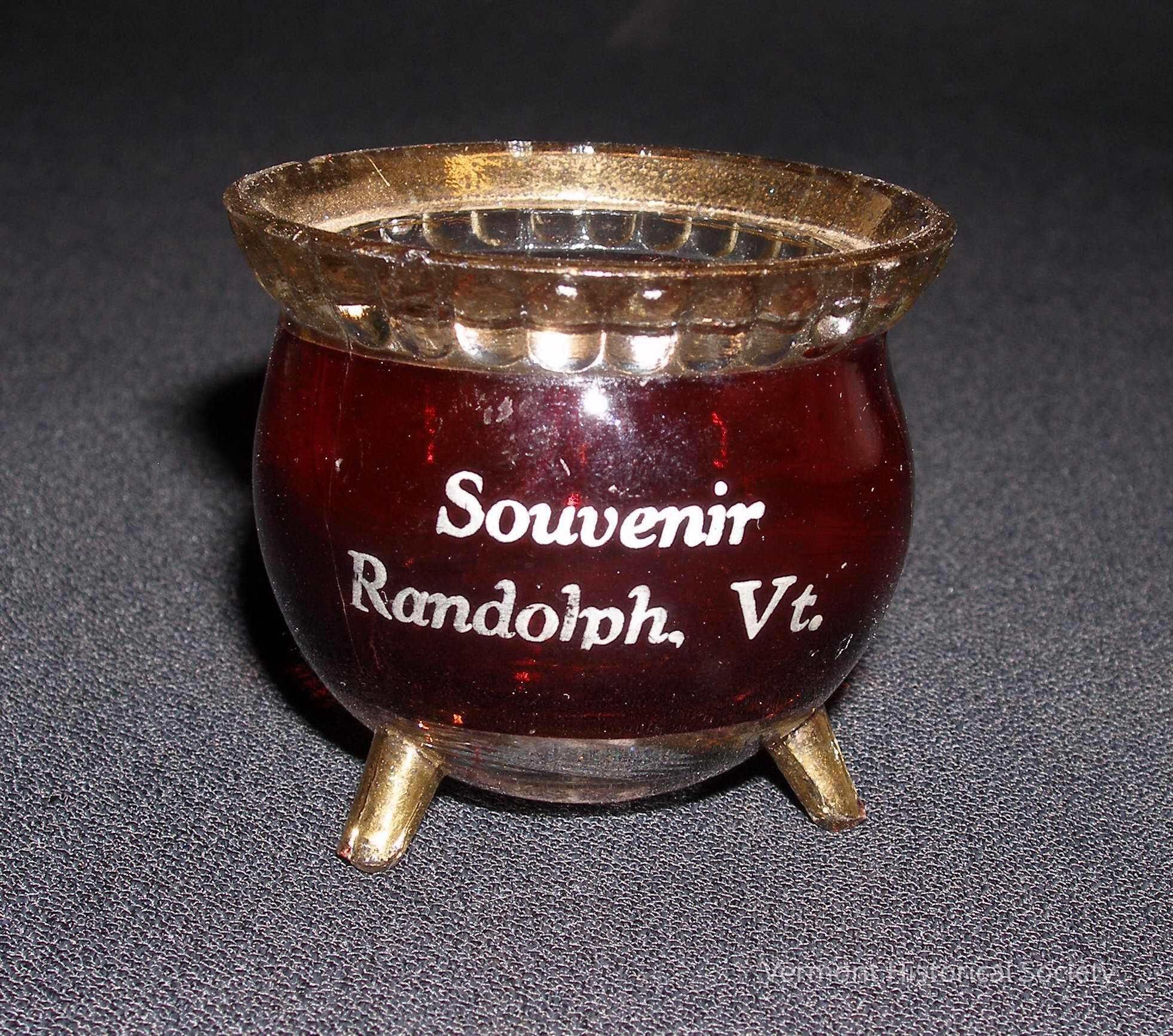 Glass toothpick holder shaped like a cauldron. There are three small fit, painted gold, and there is a gold stripe along the flared top rim. The round body of the cauldron is red and printed in white with the inscription, "Souvenir Randolph, Vt."