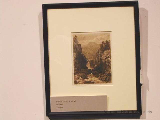 Landscape. View from top of Falls, rocket stream bed, water rushing from lower left to frothy area center foreground. Calm stream/river center middle ground. Trees and rocks left and right edge. Camel's Hump in background.Artwork Details