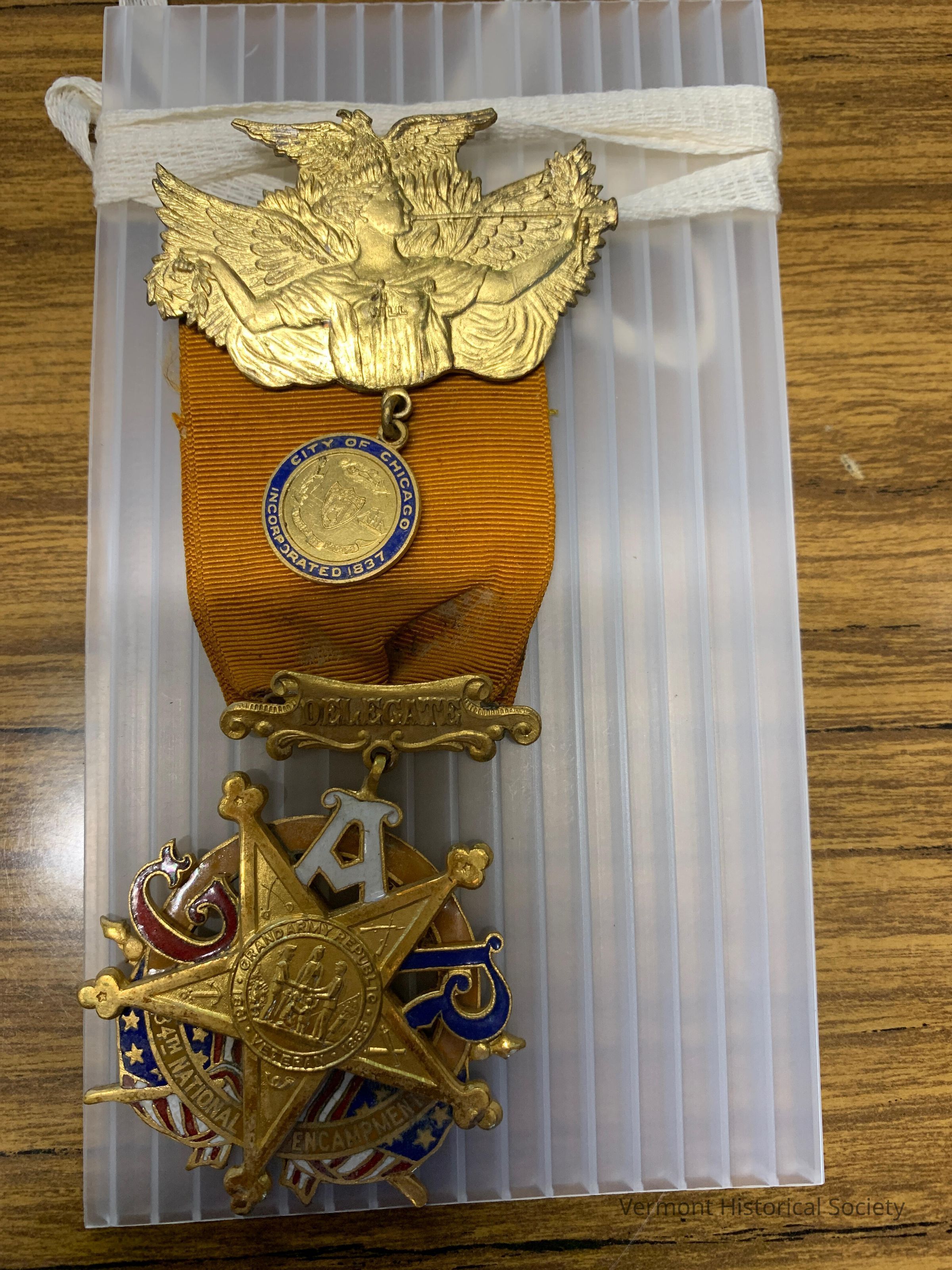 Membership ribbon consisting of a bar, ribbon, and medallion. The bar is molded into the shape of an eagle over an angel. A small round medallion hangs from the bar and is molded with a seal and the words "CITY OF CHICAGO INCORPORATED 1837". The ribbon is gold. A large gold medallion hangs from the ribbon and molded into the shape of a 5-pointed star with the GAR seal at the center. Layered beneath the star are the initials, "GAR", and crossed flags with the words, "34TH NATIONAL ENCAMPMENT".Context