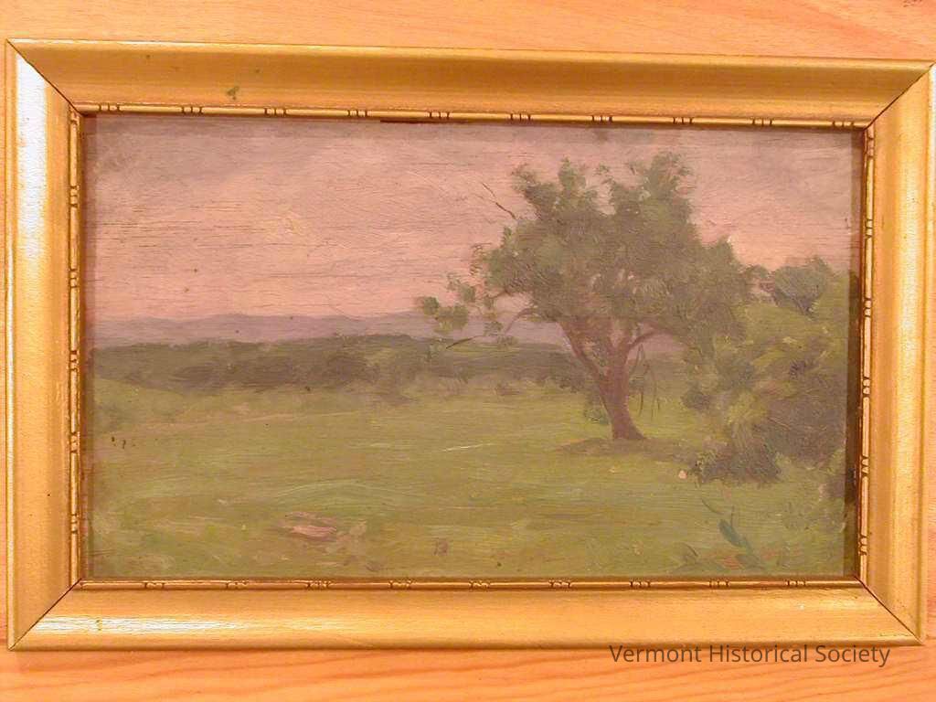 Oil painting on board showing a green field. There are trees on the right, and hills and mountains in the background. There is a sketch of a woman on the back of the board.Type of Painting