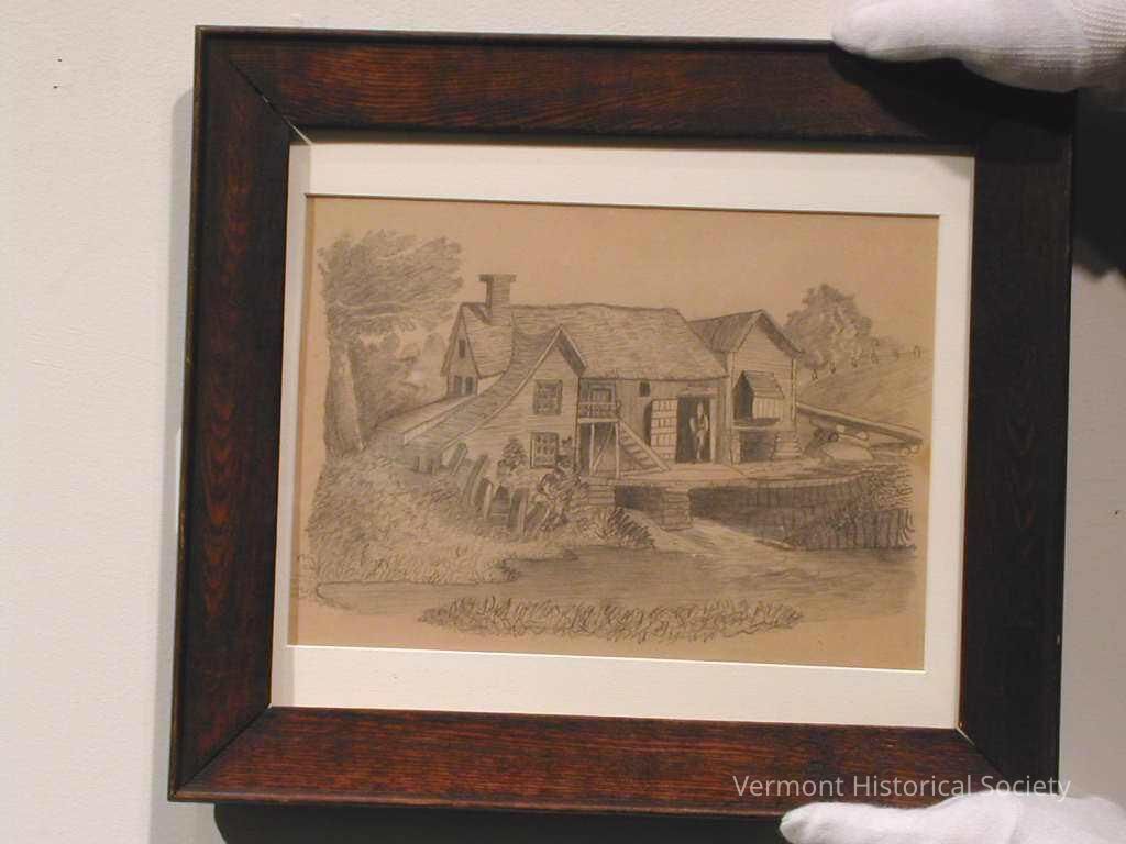 Pencil drawing showing a mill building with a person standing in the doorway. The building has two levels with both a ramp (right) and a staircase (center) on the exterior. There are trees on either side, and a millpond in front. A fence is to the right.Type of Drawing