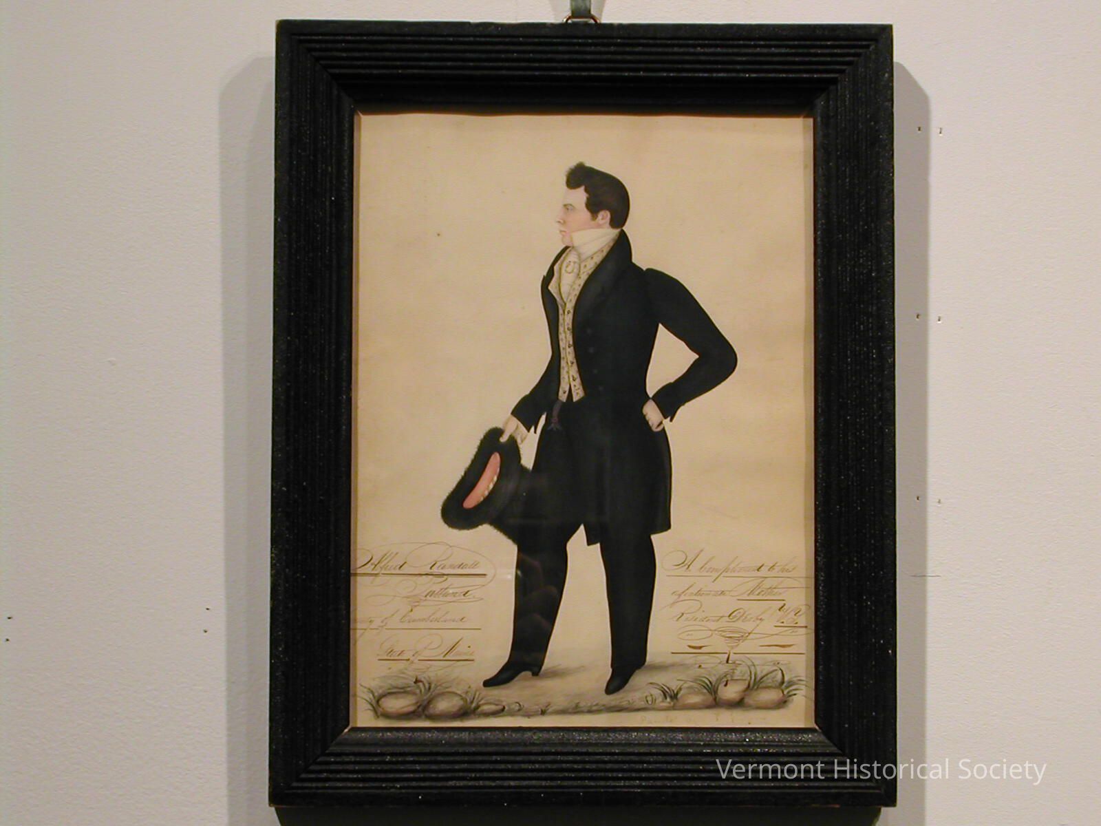 Full length profile portrait of a young man in pen and ink with watercolor highlights. The man faces left and has his left hand on his hip. He holds a tall beaver hat in his right hand. He is dressed in black pants, a black cutaway jacket, a cream colored vest, a white shirt with stand-up collar, and and a white cravat. Pinned to the cravat is a gold chain with a brooch. A blue and red watch fob with metal ornament drapes from his right front hip area. The man's hair is cut short, swept forward in front of the ears and forward, and into a wave at the forehead. There is stylized grass and rocks in foreground, and written in ink on left side of portrait is the inscription, "Alfred Randall/ Portland/ County of Cumberland/ State of Maine" Written in ink on right side of portrait is, "A Compliment to his/ affectionate Mother/ Resident Derby V.T."Artwork Details