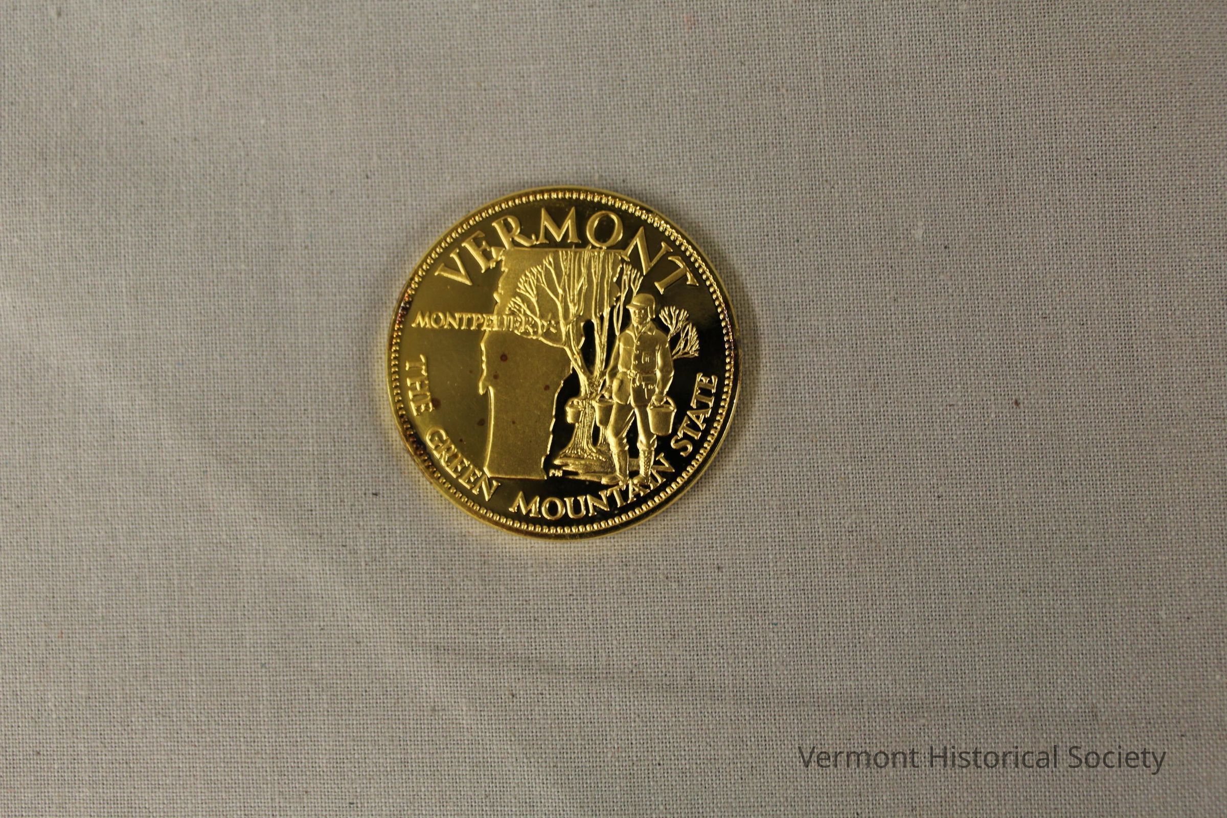 Gold plated commemorative medal. One side shows the outline of the state of Vermont behind a man in a barn coat carrying buckets away from a tapped maple tree. The inscription, "VERMONT THE GREEN MOUNTAIN STATE" rings the edge. The other side shows a laurel wreath around the edge with a clover flower at the center top. The inscription, "VERMONT ATTAINED STATEHOOD MARCH 4, 1791", in the center and "14TH STATE" at the bottom.Context