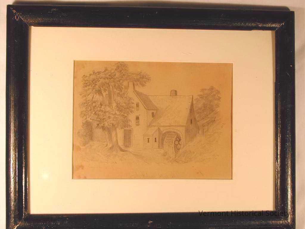 Landscape. View of a water powered grist mill. Tree in left forground. Flume comes down the right side into the mill. Notations in pencil on drawing, l to r: "Precinda Caffee/No.7/ My Father's Grist Mill/ A.M._____/ 1853."