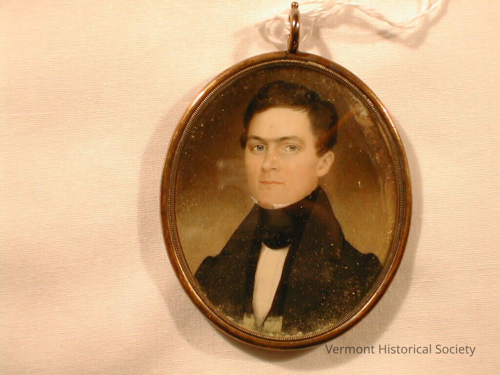 Miniature watercolor portrait of a young man painted on an oval ivory disk. The man has short brown hair with no sideburns and blue eyes. He is wearing a very high-necked black jacket, vest, and wide black cravat over a white shirt. The painting is set into a gold-toned pendant with a small glass enclosure on the reverse holding a lock of hair.Type of Painting