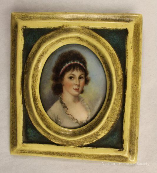 Miniature portrait of a woman. The woman has frizzy, curled hair worn high on her head, with a short fringe in the front and a plaid headband. She is facing toward the right but looking to the left of the viewer. She is wearing a white garment with a low, scooped neckline trimmed with white sheer fabric. She is shown in front of a blue sky with white clouds. The painting in held within a double frame: the inner frame is an oval, and the outer frame is a rectangle.Type of Painting