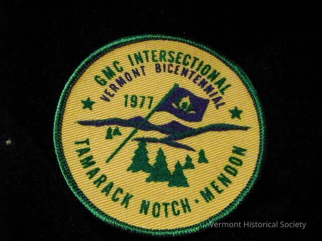 Round yellow patch edged in green. The patch has the inscription, "GMC INTERSECTIONAL / VERMONT BICENTENNIAL / 1977 / TAMARACK NOTCH . MENDON" with an illustration of a Vermont state flag flying over evergreen trees and mountains.