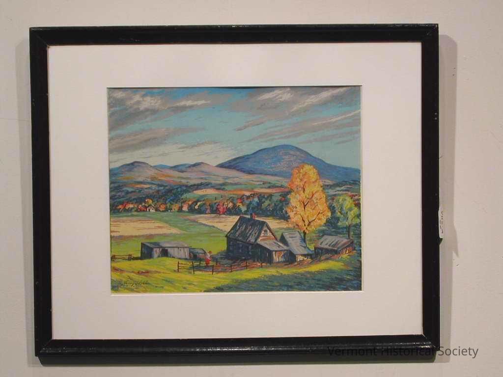 Full-color print showing a landscape viewed from an elevated position. The scene shows a farm complex at the edge of a valley field with three mountains int he background.