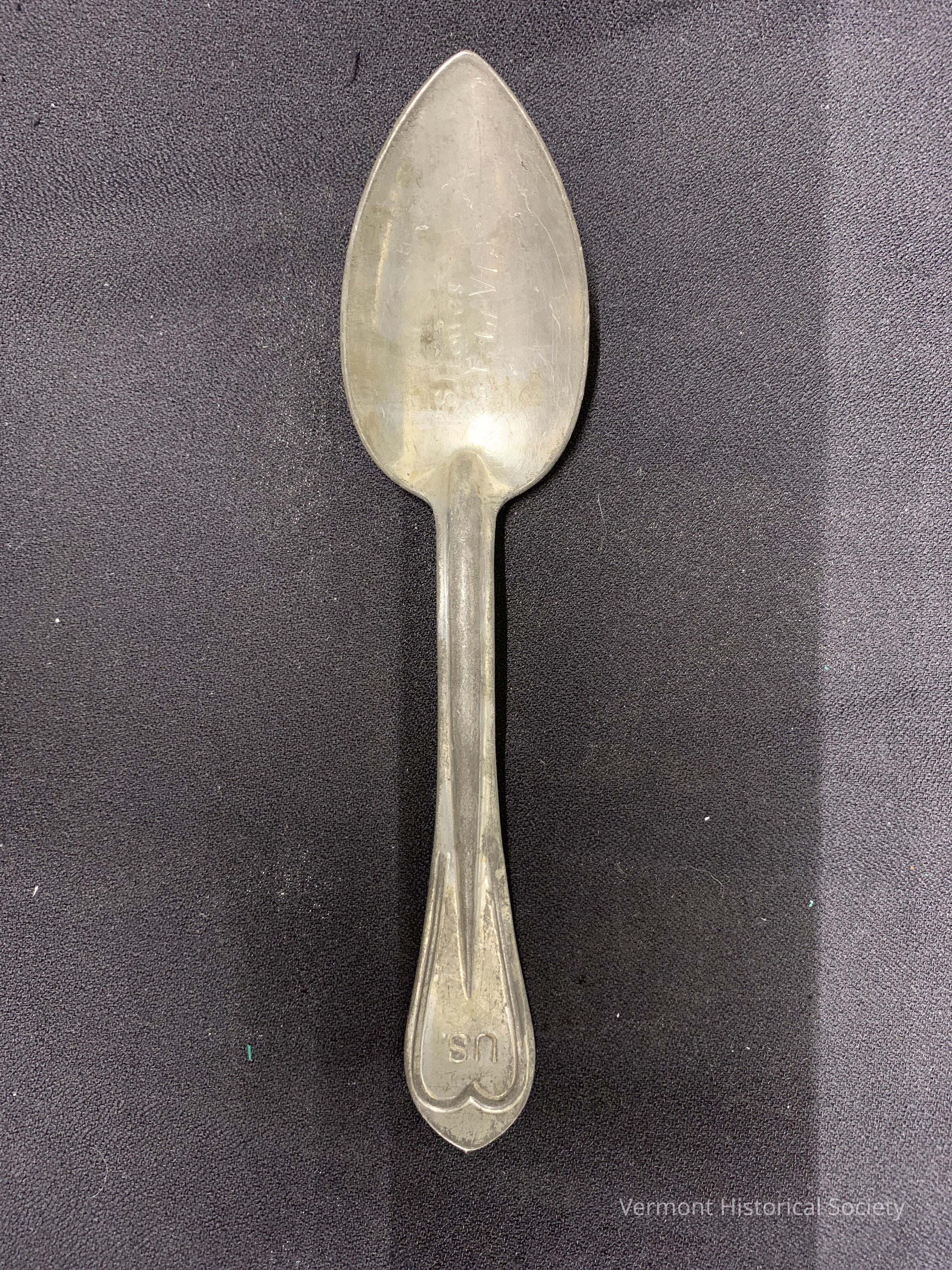 Stamp molded tin spoon with a pointed bowl. The handle is stamped with "U.S." The inside of the bowl is engraved with the inscription, "P. S. Howes Co F 1st Vt".Context
