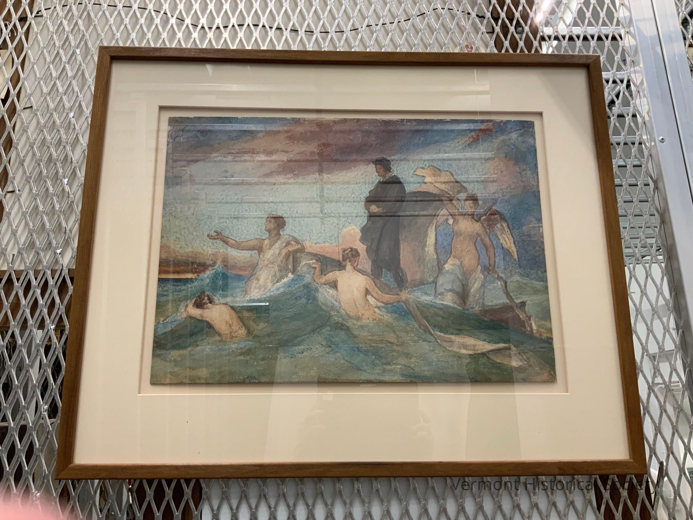 William Morris Hunt, one of the most famous artists of his day, suffered from severe depression and possibly other mental illness. His older sister, Jane Maria Hunt, served as his companion and support during the creation of these murals. A fine artist herself, she created the watercolor of his finished mural you see here. William died by drowning shortly after these murals were completed in a suspect suicide.Acquisition