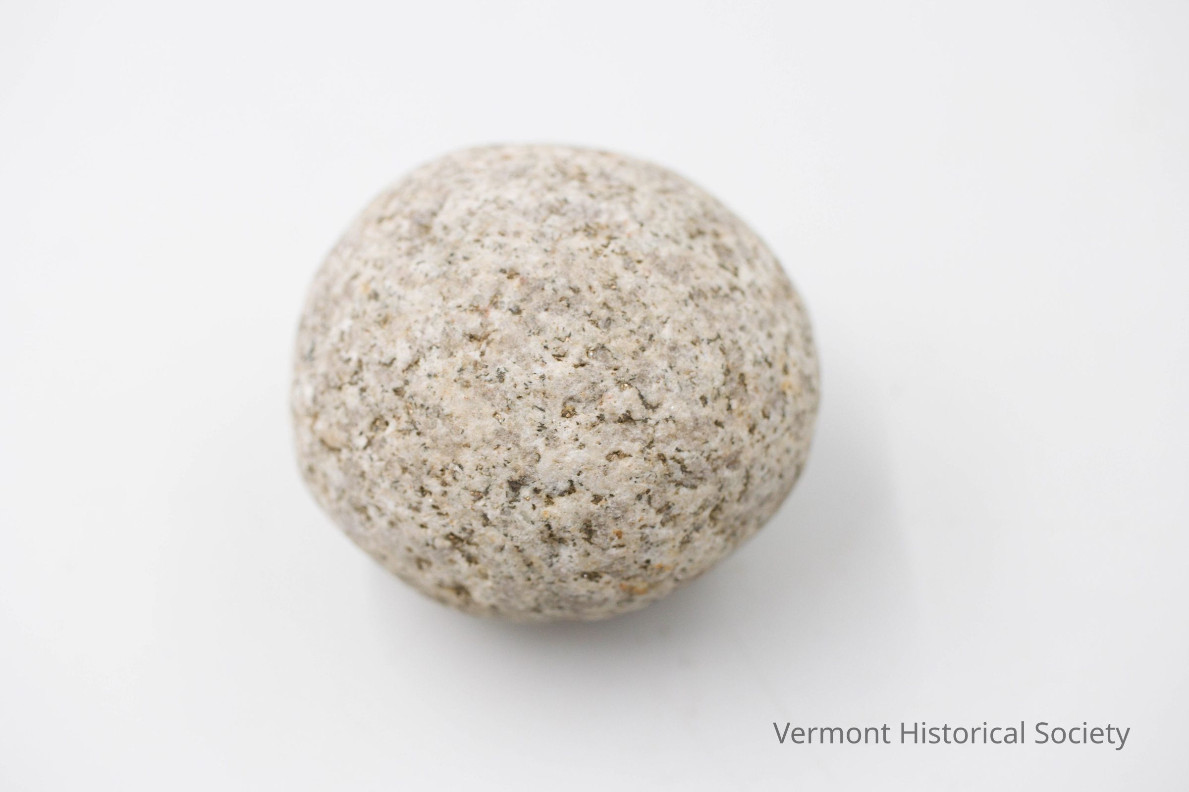 Naturally formed round rock. One side of the rock is labeled "Glacial Pebble, Vermont" in white ink on yellowed varnish barrier.Acquisition