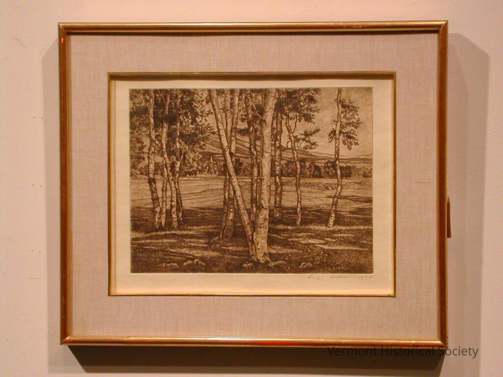 Landscape print. In the foreground, there is a prominent stand of birch trees. Moving towards the middle ground, there is a meadow or field. The background of the artwork shows distant trees and hills. A steeple can be seen among the trees.