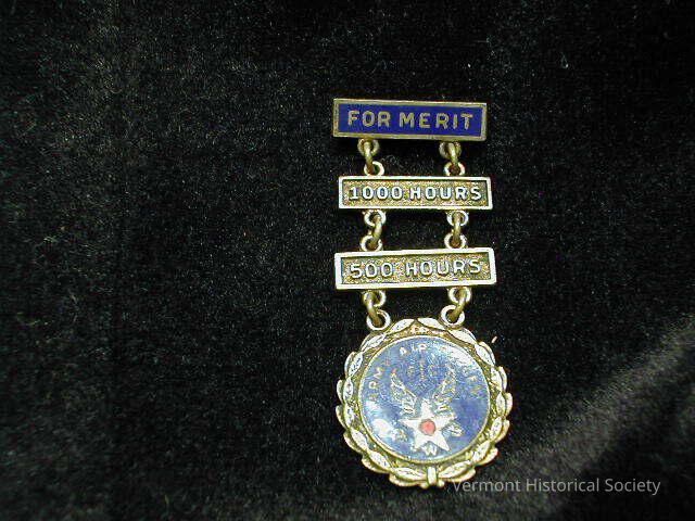 Medal consisting of four parts (three rectangular bars and a circular medallion) connect by short lengths of chain. The top bar reads, "FOR MERIT", the second bar reads, "1000 HOURS", and the third bar reads, "500 HOURS". The medallion at the bottom has the a winged white star with a red center on a blue ground within a laurel wreath.