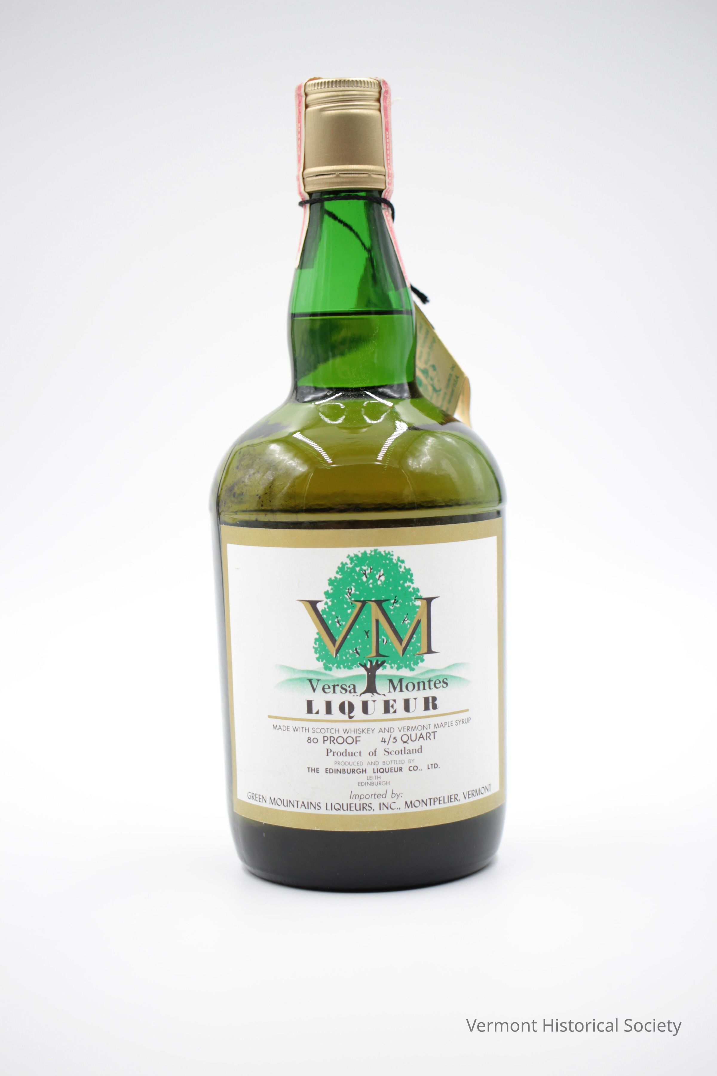 Green glass bottle with plastic screw-on cap. The bottle is full of liquid and has never been unsealed. The front of the bottle has a paper label with an image of a tree and the name, "Versa Montes Liqeur". The back of the bottle has a label explaining that the liquid inside is a mixture of maple syrup and scotch. A small paper booklet of cocktail recipes hangs from the bottle's neck.Context