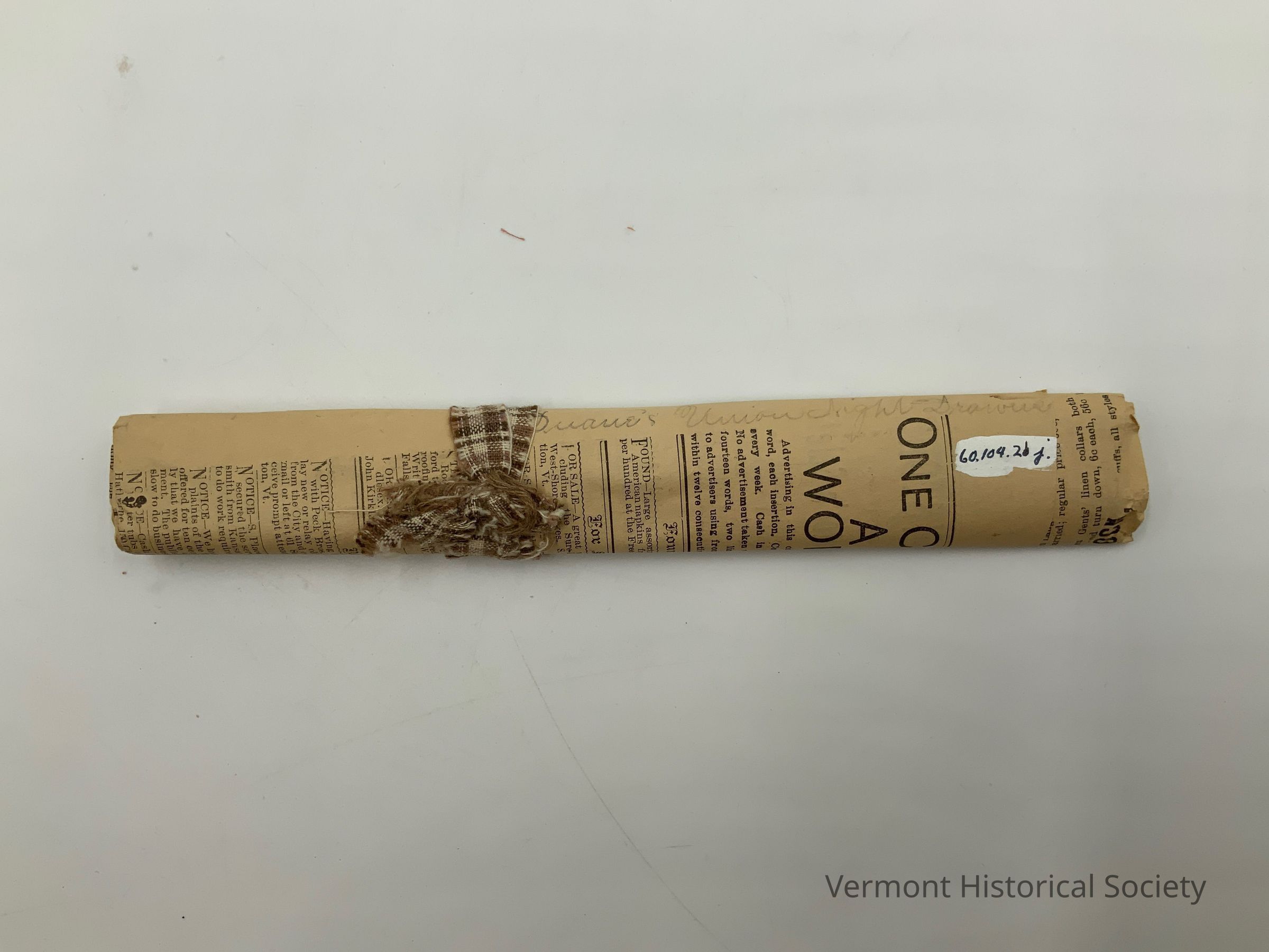 Sewing pattern cut from a newspaper. The pattern pieces are folded, then rolled together and tied with a strip of brown-and-white plaid cotton. The outermost piece is labeled in pencil, "Duane's Union Night Drawers".Context