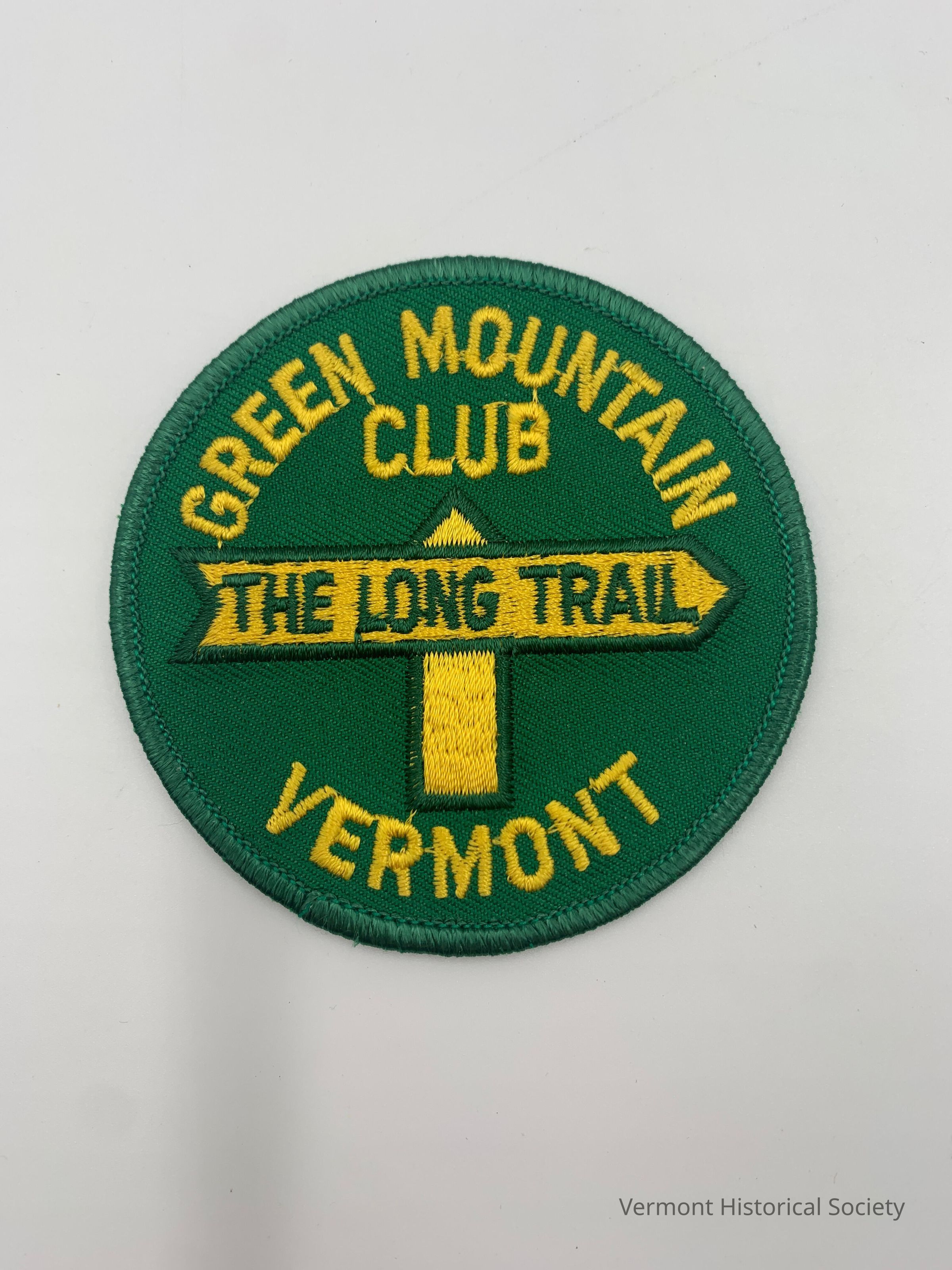 Round green patch embroidered in yellow with the words, "GREEN MOUNTAIN CLUB VERMONT" and a wayfinding sign that reads, "THE LONG TRAIL".