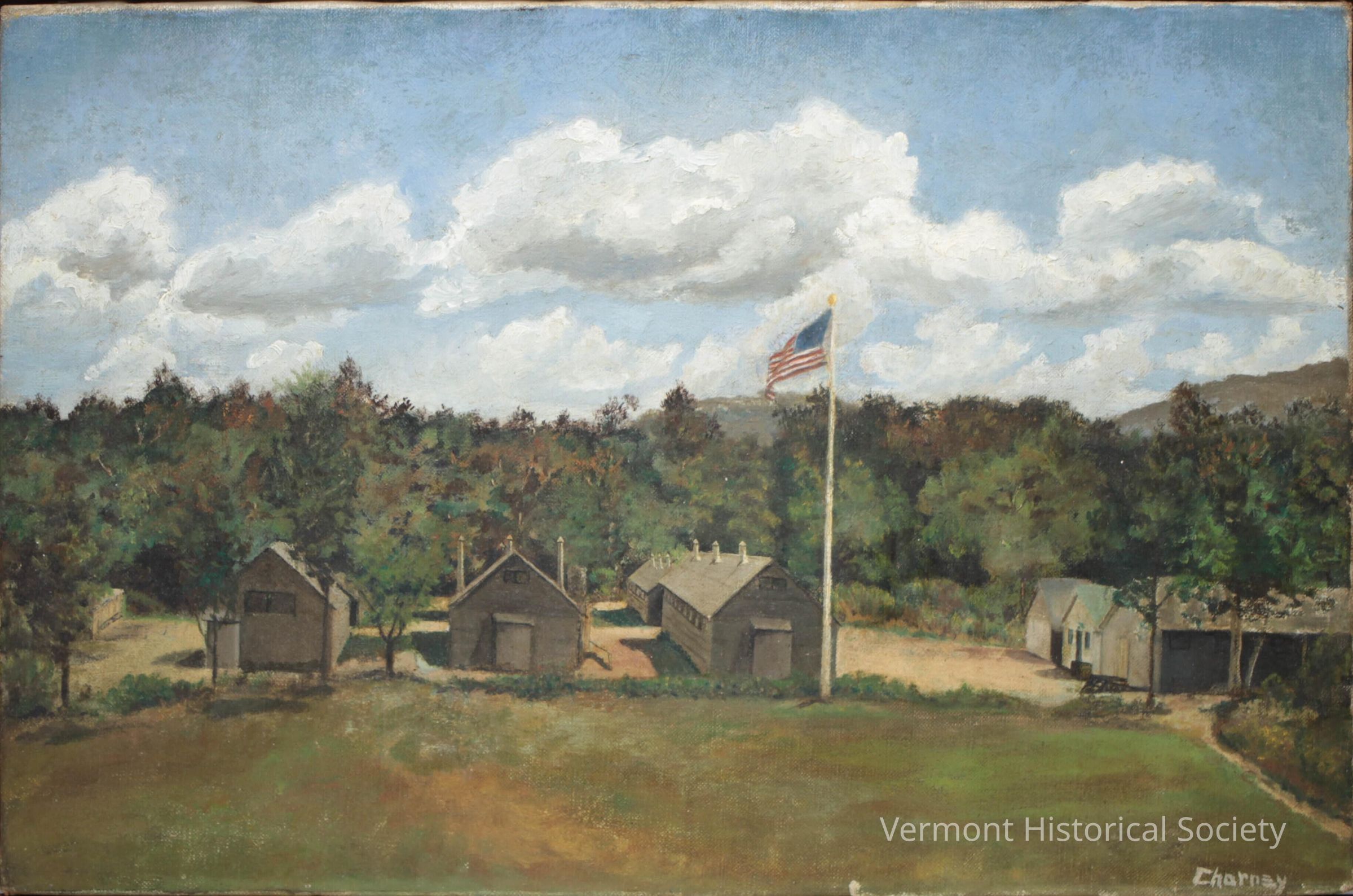 This view of the Civilian Conservation Corps camp in Peru, Vermont shows the typical construction and layout of barracks buildings. Organized along in the same way as the military, the camps and groups of men took on a distinctly martial feel in organization and process.