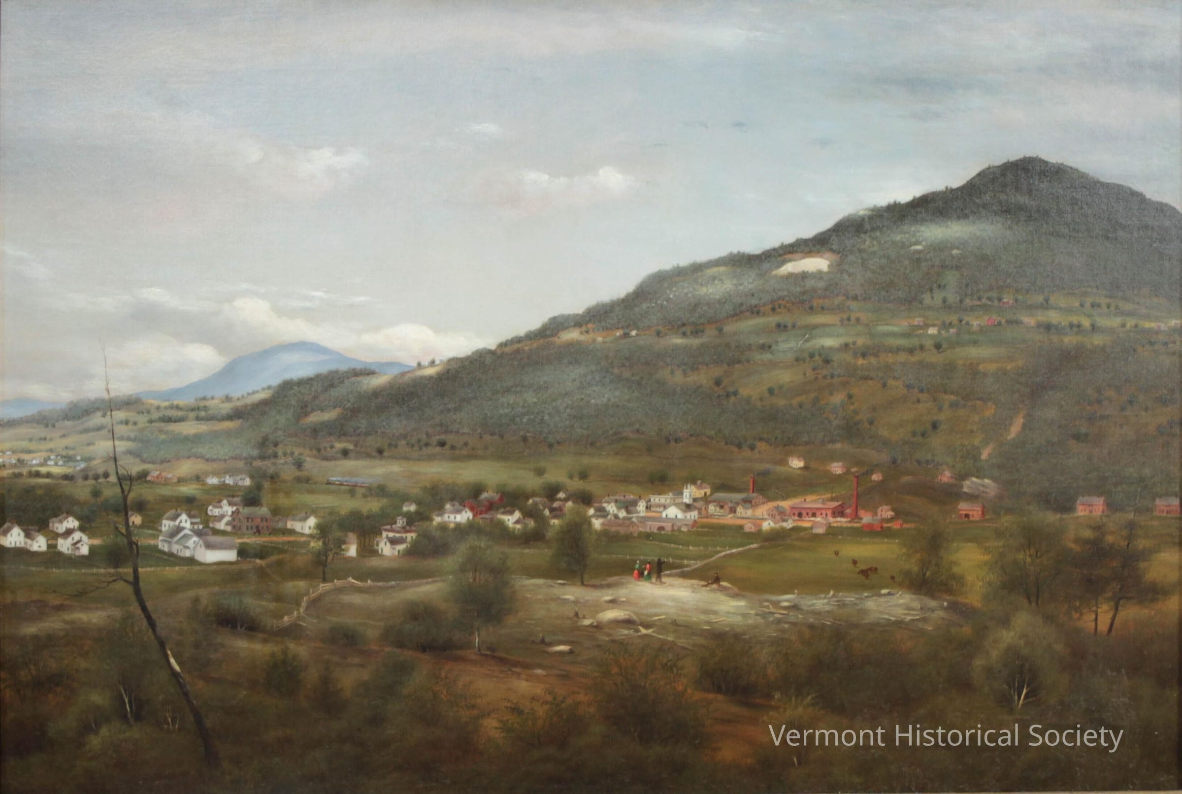 Large oil painting, showing a landscape. The landscape consists of a wide valley with a mountain in the middle ground, right. Within the valley is a village that consists of several white houses, some brick buildings, a church, and at least two factories. There are several fields, some containing livestock. In the foreground, on what appears to be charred land, is a group of people, one of whom is pointing towards the mountain. The train crosses the valley at the center. There is another round Mountain further off in the distance on the left. The painting is in a large but simply molded gilded frame.Artwork Details