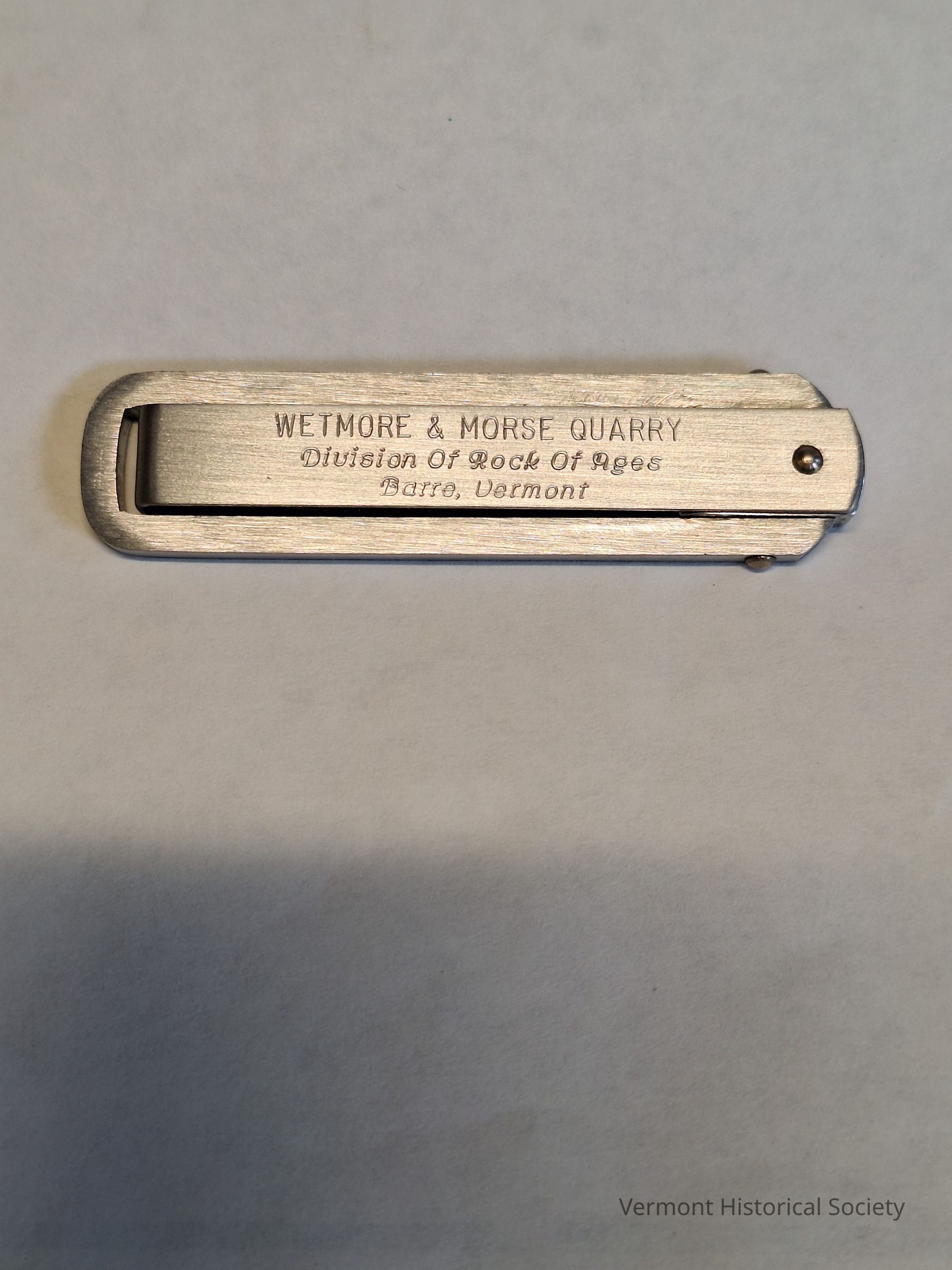 Pocket knife. The knife has an oval stainless steel frame with movable covered blade. The middle section contains a thin, small blade with a central hinged sheath. Stamped on one side of rectangular middle section are the words, "WETMORE & MORSE QUARRY / Division Of Rock Of Ages / Barre, Vermont". There is a manufacturer's mark on the end of the sheath that reads, "B&B ST. PAUL / MINN USA"