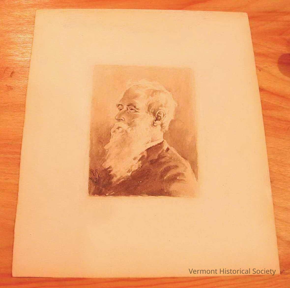 Watercolor portrait of an older man with a long white beard and short hair. He is shown at profile facing left. He is wearing a suit jacket. The painting is signed at the lower left, "R.R."Artwork Details
