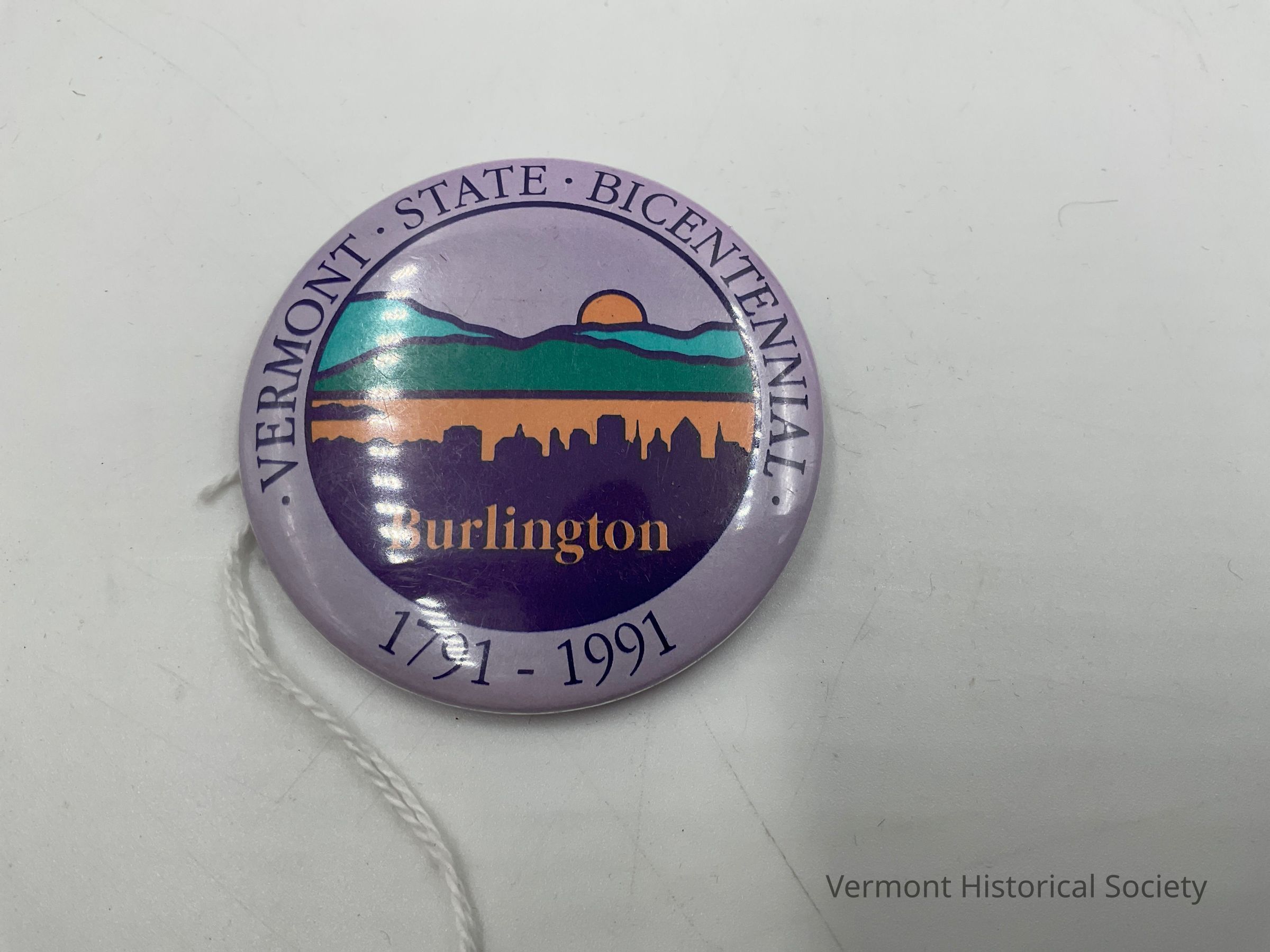 Round metal button with a silhouette of a city skyline in front of mountains over a pink background. The word "Burlington" is over the silhouette, and the words, "VERMONT STATE BICENTENNIAL 1791 - 1991" ring the edge.Acquisition