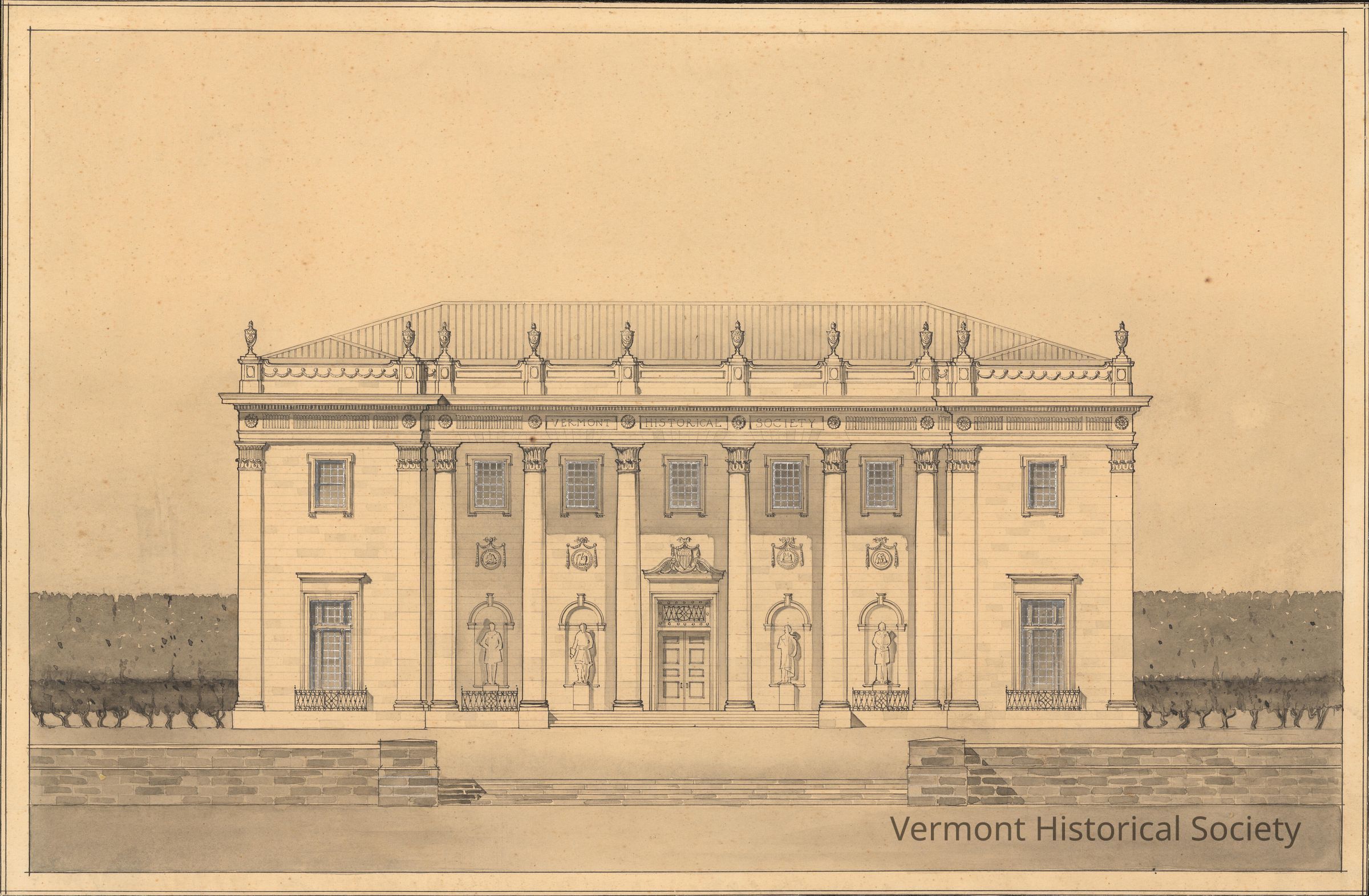 Architectural elevation showing a large, neoclassical building. The building has a central front portico bordered by 6 columns. There is a central entrance flanked by four statues.Acquisition