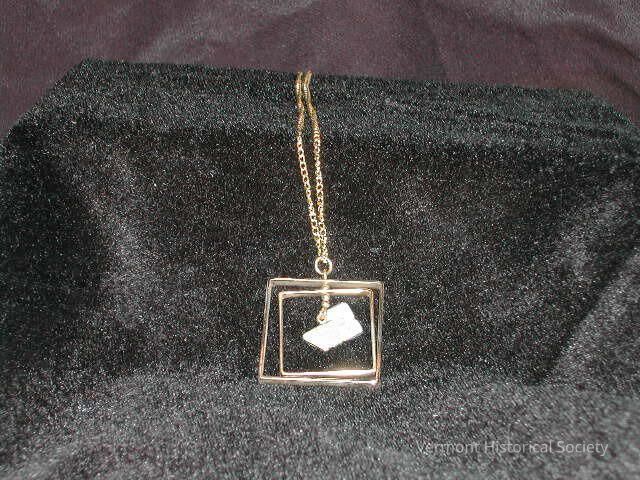 Necklace with an enameled pendant in the same of the initials, "VT2", in bubble letters. The pendant hangs in the center of 2 squares, forming a frame. It is on a long, gold-toned chain.